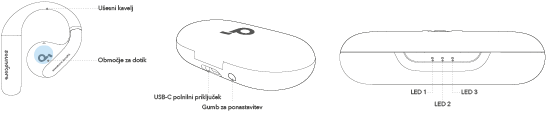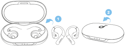 Ko s slušalk odstranite izolacijske nalepke, slušalke vrnite v polnilno torbico in pritisnite gumb za ponastavitev, da vklopite povezovanje Bluetooth. Povežete se lahko tudi tako, da zaprete in ponovno odprete pokrov torbice, ko so slušalke spet v torbici. Slušalke se bodo ob prvi povezavi samodejno vklopile in vstopile v način povezovanja Bluetooth. Za povezavo izberite »soundcore AeroFit« na seznamu Bluetooth vaše naprave. Pri povezovanju se začnejo kazalniki LED na polnilni torbici pomikati. Po uspešnem povezovanju kazalniki LED v polnilni torbici svetijo 2 sekundi in se ugasnejo.