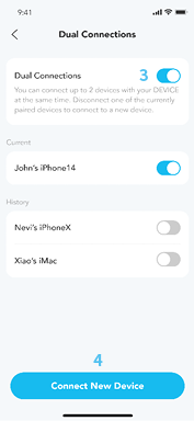 이어버드를 두 개의 블루투스 장치와 동시에 연결하려면 soundcore 앱을 열고 설정으로 이동한 후 이중 연결 > 이중 연결 활성화 > 새 장치 연결을 선택합니다.