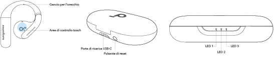 Custodia di ricarica: L'indicatore LED 1 si illuminerà per 3 secondi e si spegnerà.