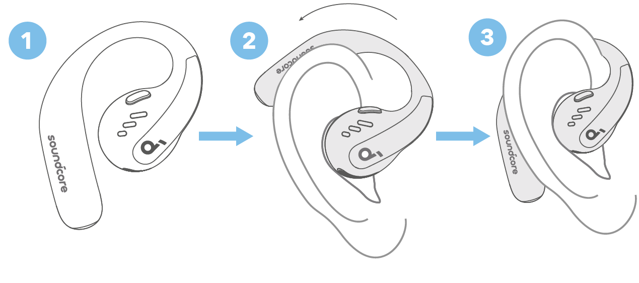 Σηκώστε τα ακουστικά από τη θήκη φόρτισης και, στη συνέχεια, περιστρέψτε τα γαντζάκια πάνω στα αυτιά σας για να επιτύχετε σωστή τοποθέτηση.