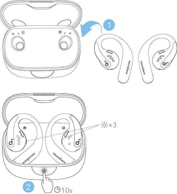 Διαγράψτε πρώτα το ιστορικό συζεύξεων από τη συσκευή Bluetooth. Τοποθετήστε τα ακουστικά μέσα στη θήκη φόρτισης και αφήστε την ανοιχτή. Πιέστε το κουμπί της θήκης φόρτισης μέχρι τέρμα και κρατήστε το πατημένο για 10 δευτερόλεπτα μέχρι οι ενδείξεις LED στη θήκη φόρτισης να αναβοσβήσουν τρεις φορές.