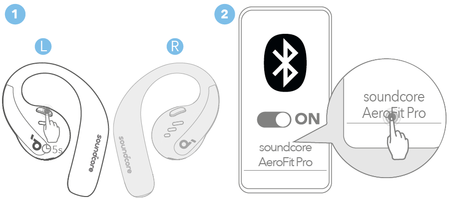 Αφού αφαιρέσετε τα αυτοκόλλητα μόνωσης στα ακουστικά, τοποθετήστε ξανά τα ακουστικά στη θήκη φόρτισης και, στη συνέχεια, πατήστε το κουμπί για να ενεργοποιήσετε τη ζεύξη Bluetooth. Επίσης, μπορείτε να κάνετε ζεύξη κλείνοντας και ανοίγοντας ξανά το καπάκι της θήκης, μόλις τα ακουστικά τοποθετηθούν στη θήκη. Τα ακουστικά θα εισέλθουν αυτόματα σε λειτουργία ζεύξης Bluetooth όταν συνδεθούν για πρώτη φορά. Επιλέξτε "soundcore AeroFit Pro" στη λίστα Bluetooth της συσκευής σας για να συνδεθείτε.
