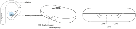 Opladningsetui: LED 1-indikatoren lyser i 3 sekunder og slukker derefter.