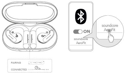 Ta bort skyddsfilmen från öronsnäckorna och sätt tillbaka dem i laddningshöljet och tryck sedan på återställningsknappen för att aktivera parkoppling med Bluetooth. Det går även att parkoppla genom att stänga och öppna höljets lock på nytt när öronsnäckorna ligger i höljet. Sedan aktiverar öronsnäckorna parkopplingsläge automatiskt med Bluetooth när de ansluts för första gången. Anslut genom att välja soundcore AeroFit på enhetens Bluetooth-lista. Under parkoppling blinkar lysdioderna i laddningshöljet att rulla. Efter slutförd parkoppling tänds lysdioderna på laddningshöljet i två sekunder och släcks sedan.