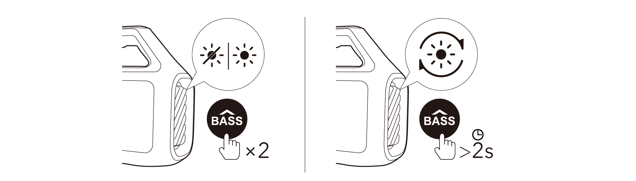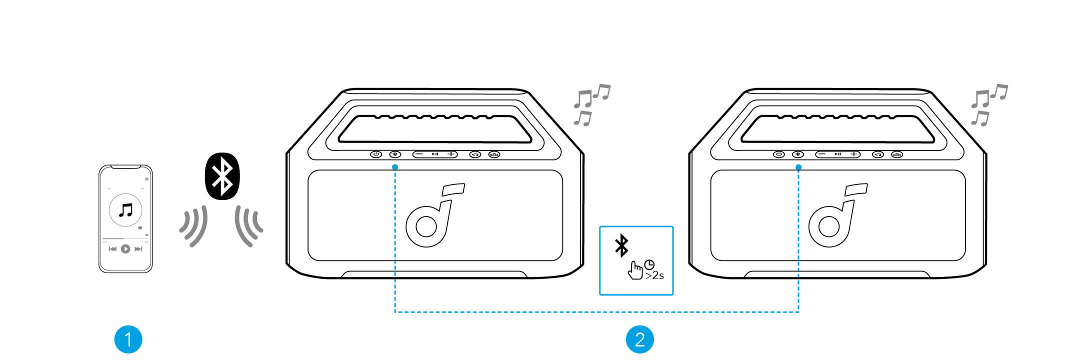 將一個揚聲器連接到智慧型手機後,在兩個揚聲器上按住藍牙按鈕2秒鐘進入TWS配對模式。