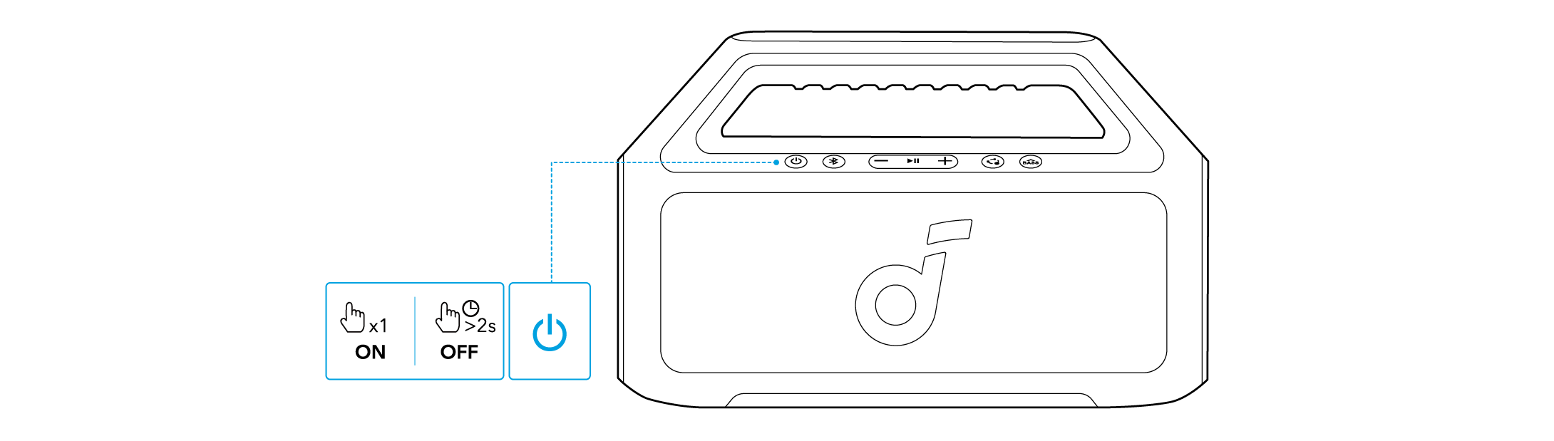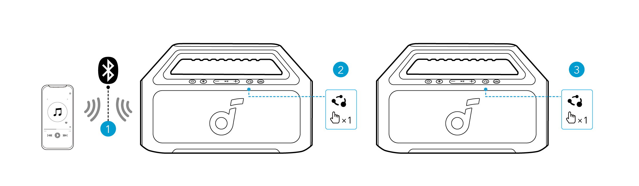 將一個揚聲器連接到智慧型手機,按下最多100個具有PartyCast功能的soundcore揚聲器上的PartyCast按鈕,以同步音頻和燈光。
