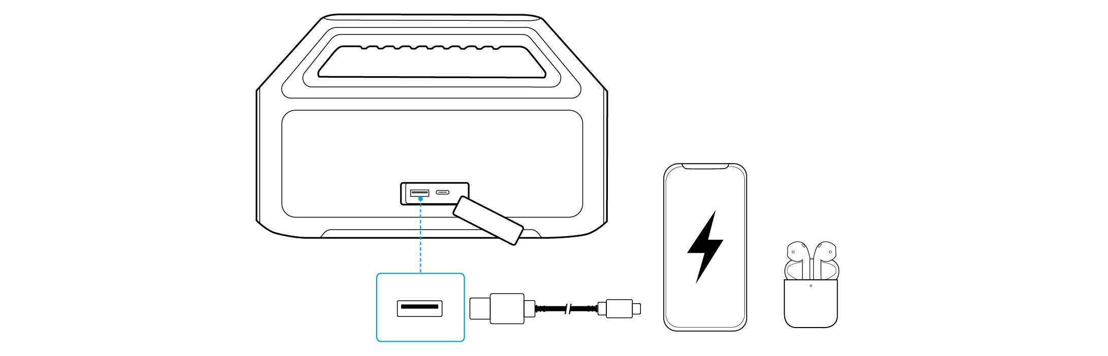 이 스피커를 이용하여 휴대용 기기나 액세서리를 충전하는 파워 뱅크로 사용하세요.