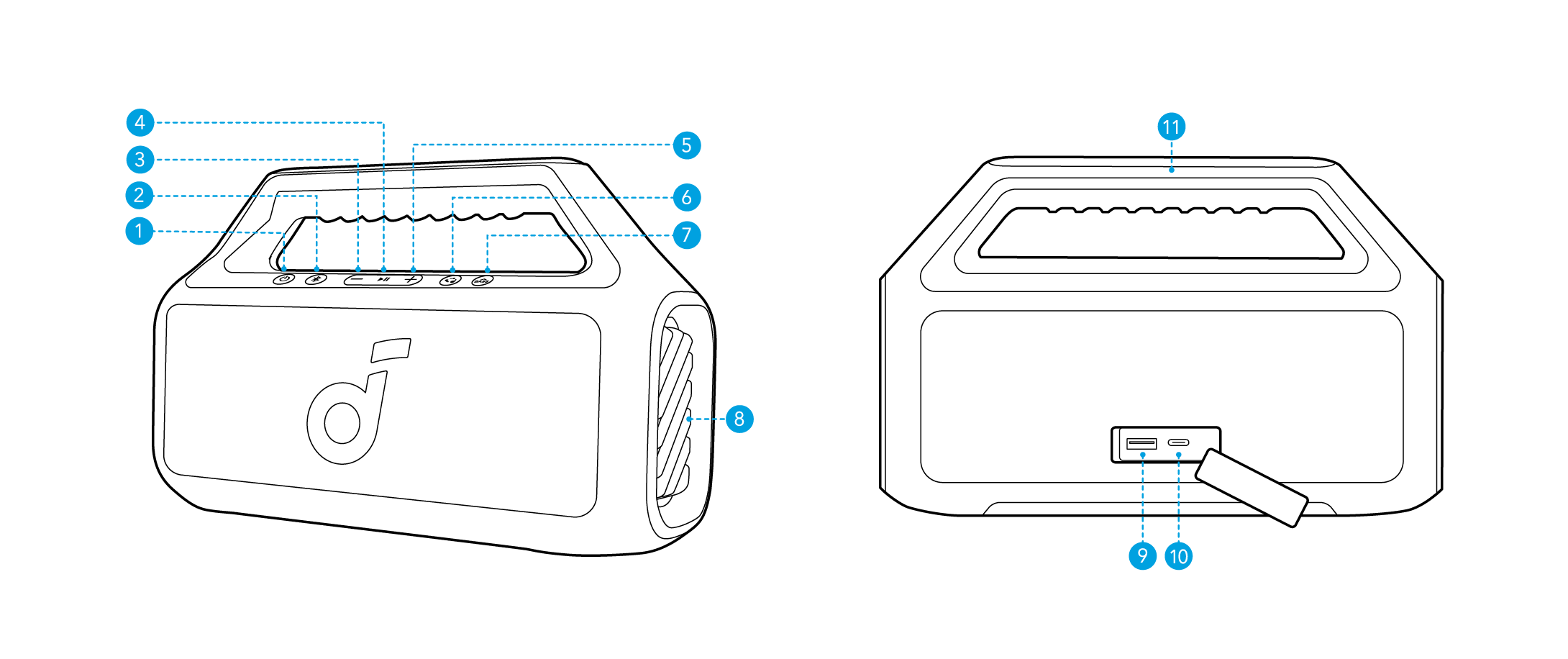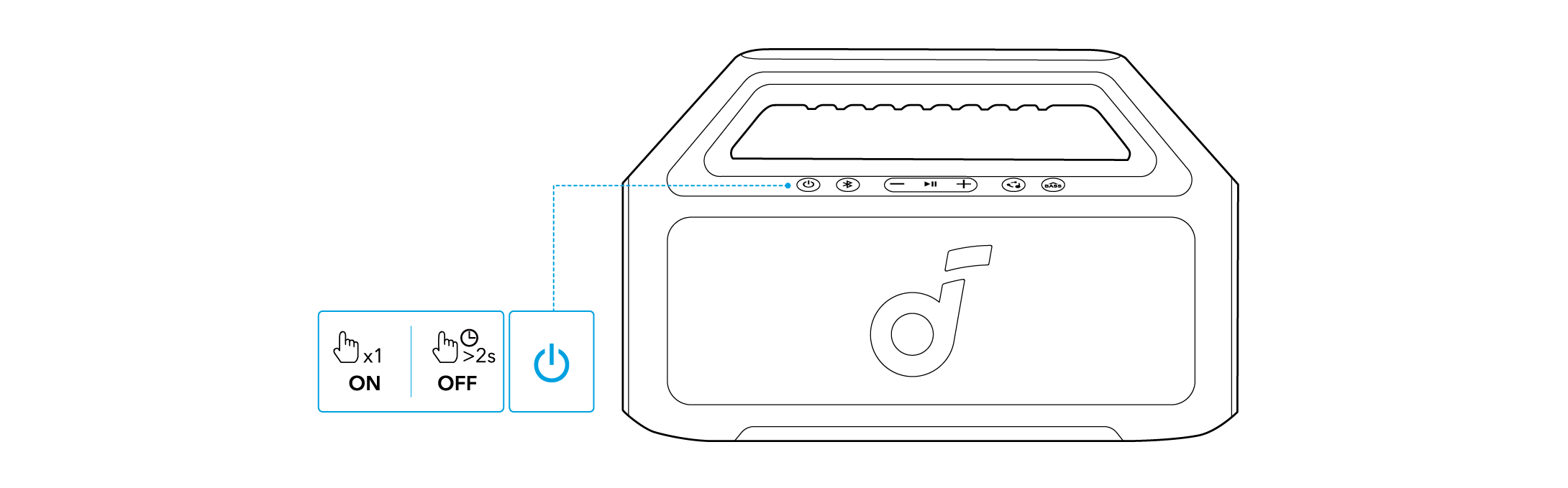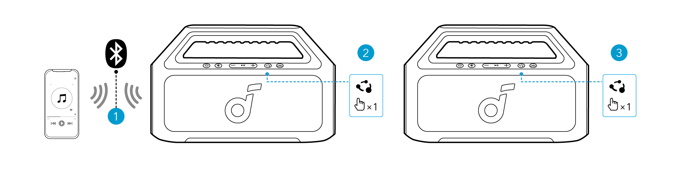 Avec un haut-parleur connecté à un smartphone, appuyez sur le bouton PartyCast sur jusqu'à 100 haut-parleurs soundcore avec la fonction PartyCast pour synchroniser l'audio et la lumière.
