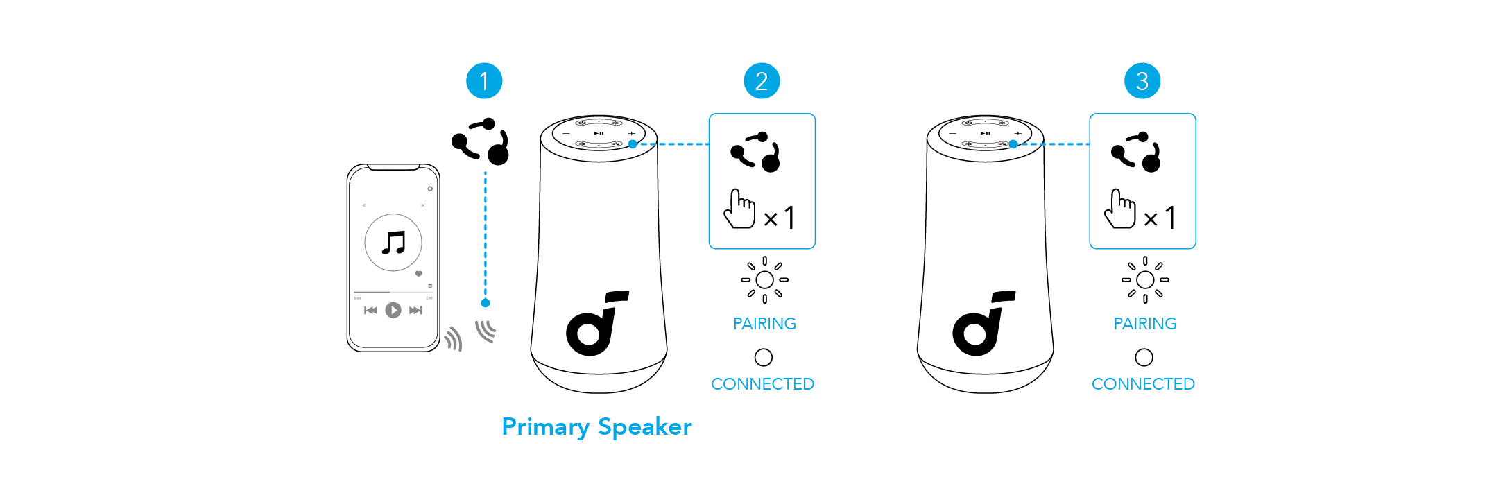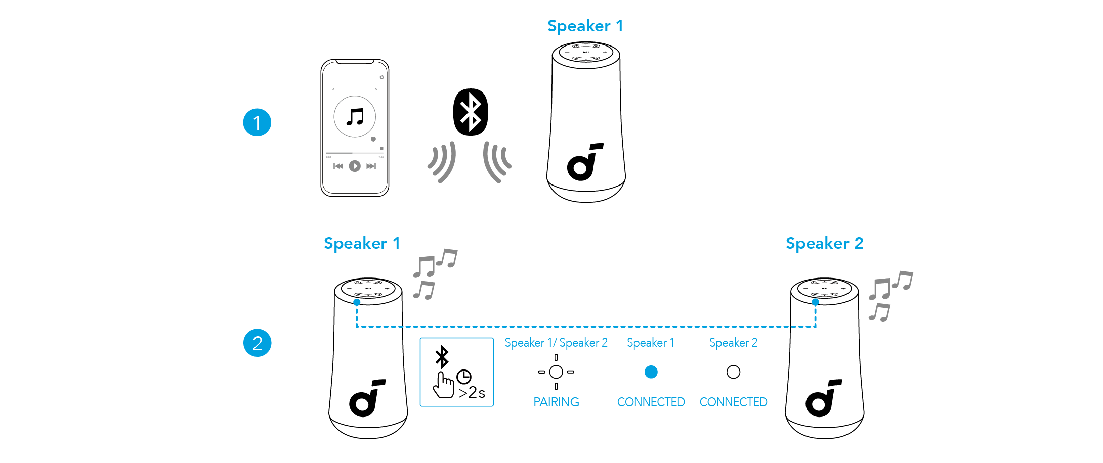 عندما يتم توصيل مكبر صوت واحد بالهاتف الذكي، اضغط على زر PartyCast على ما يصل إلى 100 مكبر صوت soundcore مزود بوظيفة PartyCast لمزامنة الصوت والإضاءة.