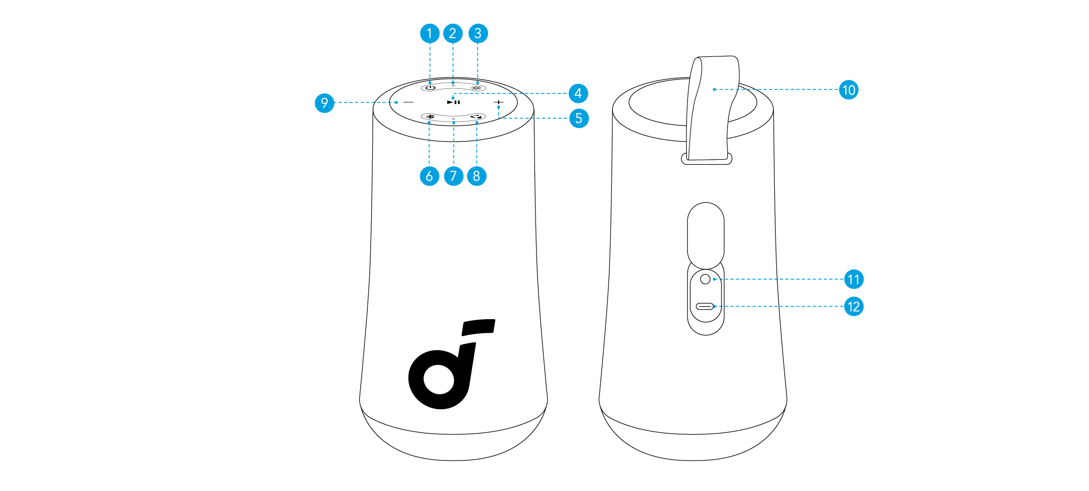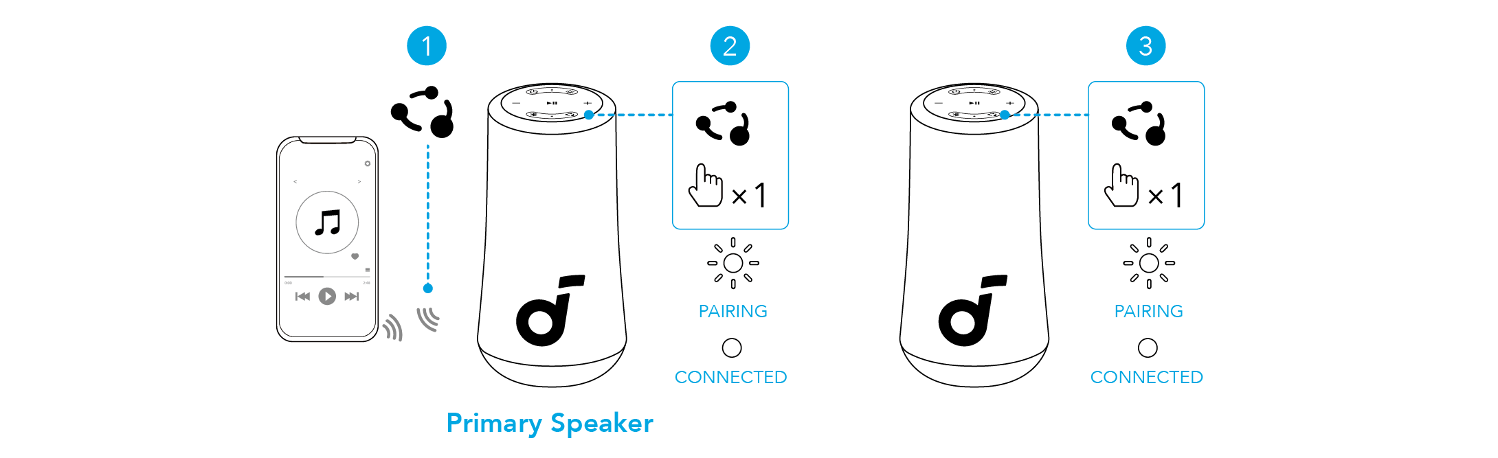 连接一个音箱到智能手机,可以最多按下100个带有PartyCast功能的soundcore音箱上的PartyCast按钮,同步音频和灯光。