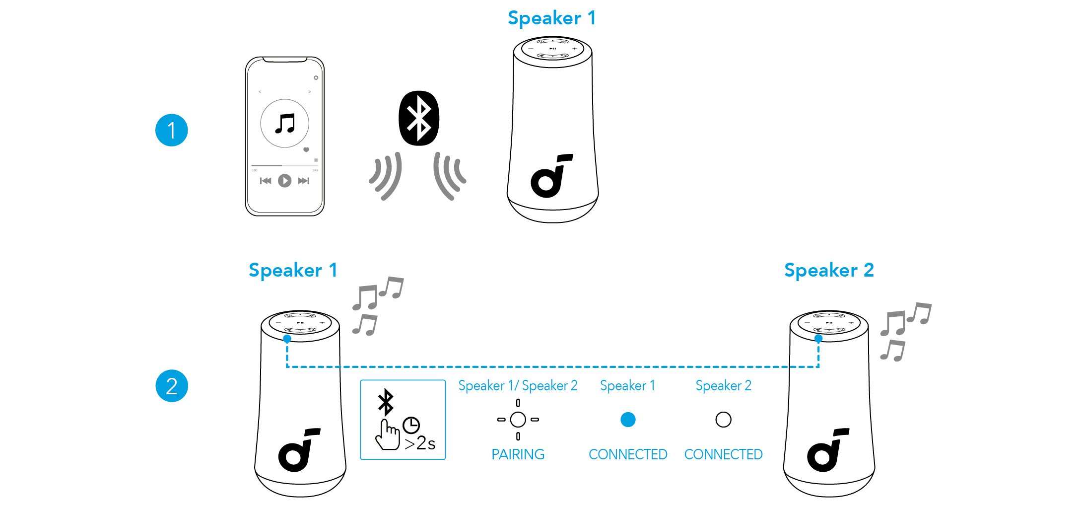 将一个音箱连接到智能手机后,在两个音箱上按住蓝牙按钮2秒钟,即可进入TWS配对模式。