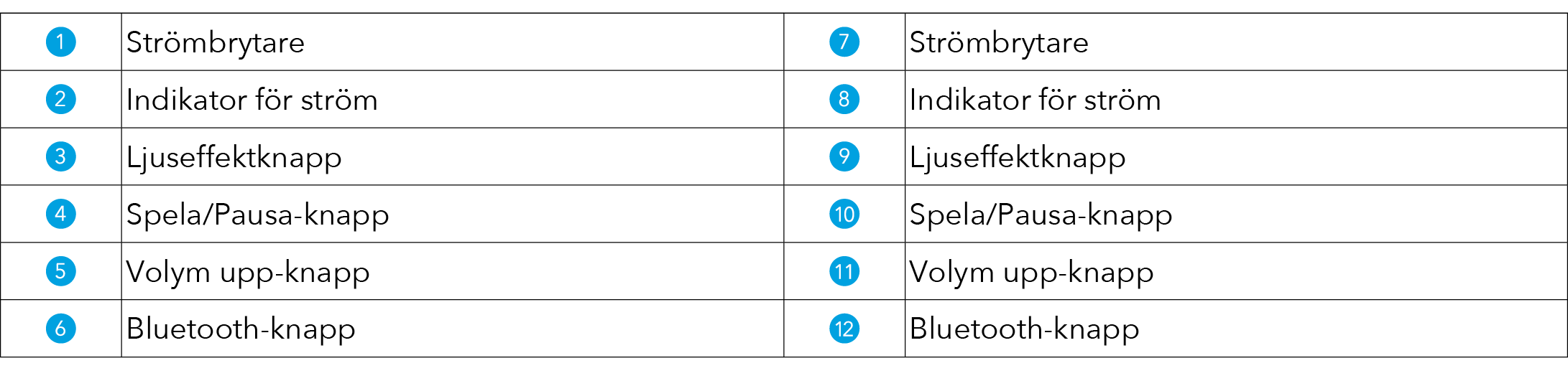 Batteristatus: Indikerar batterinivån på högtalaren.