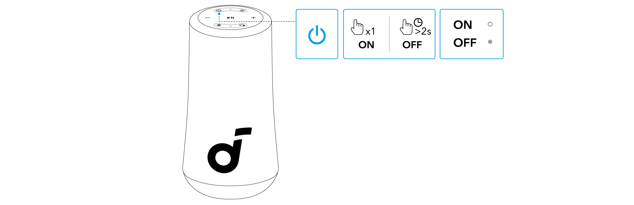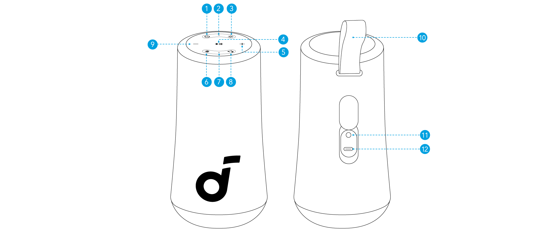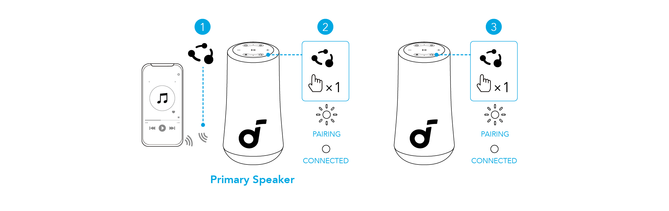 Med en högtalare ansluten till en smartphone, tryck på PartyCast-knappen på upp till 100 soundcore-högtalare med PartyCast-funktion för att synkronisera ljud och ljus.