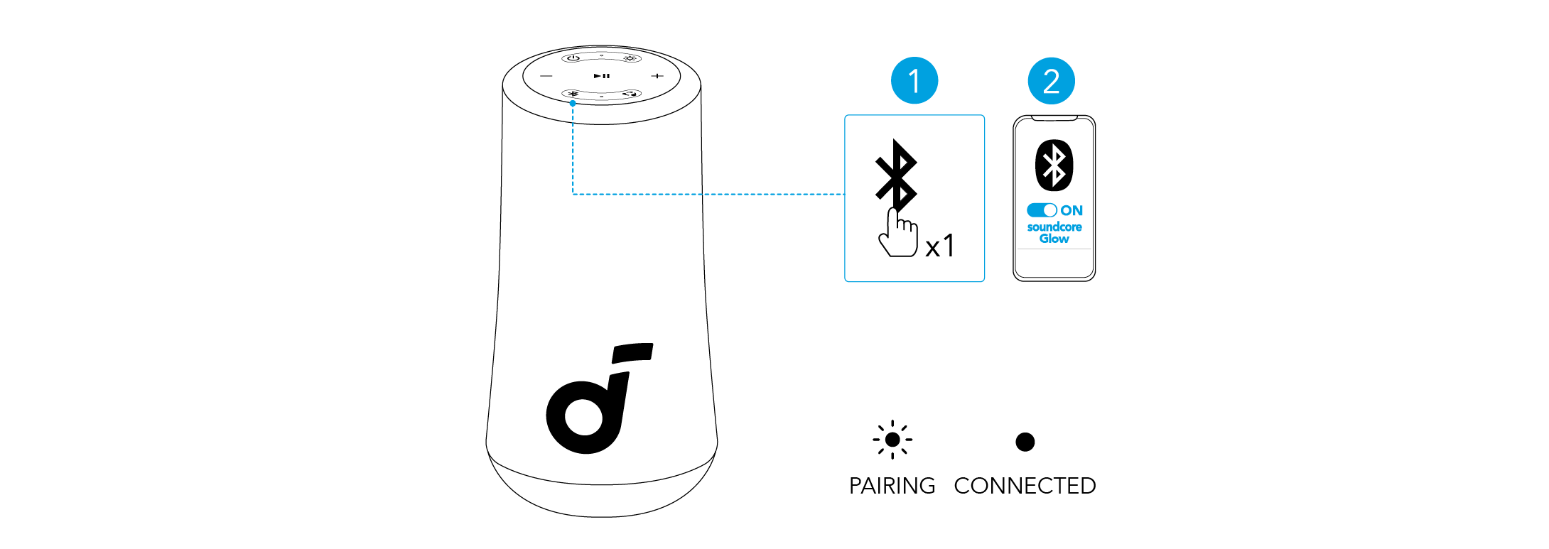 Tryck på Bluetooth-knappen för att komma in i Bluetooth-parningsläge, välj sedan "soundcore Glow" från Bluetooth-listan för att ansluta.
