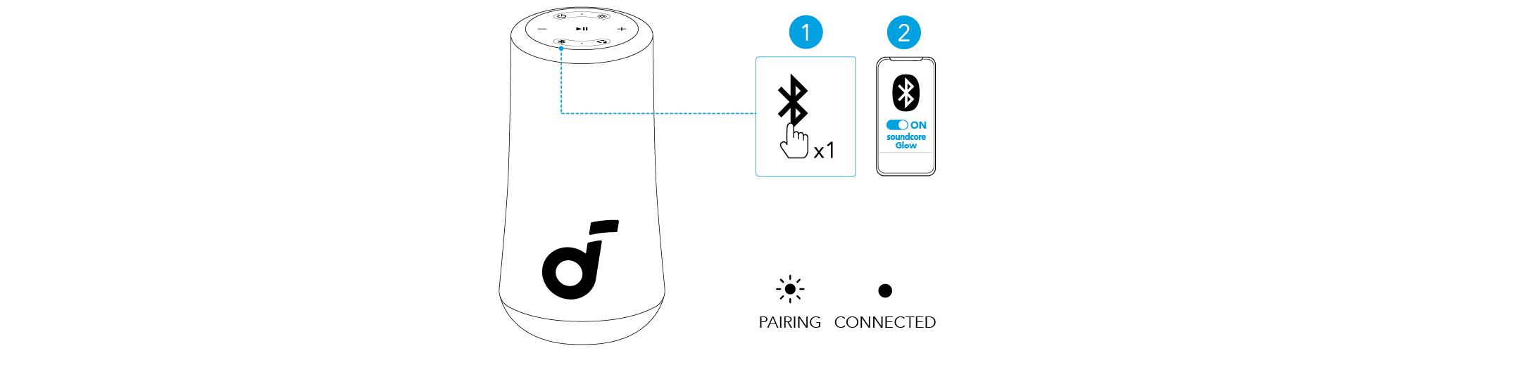 Drücken Sie die Bluetooth-Taste, um in den Bluetooth-Kopplungsmodus zu gelangen, wählen Sie dann "soundcore Glow" aus der Bluetooth-Liste aus, um eine Verbindung herzustellen.
