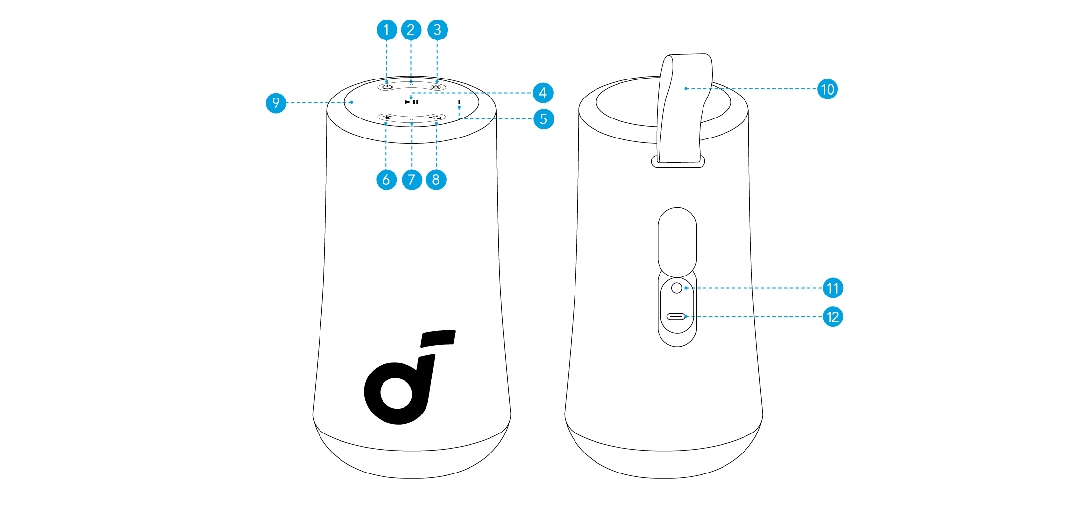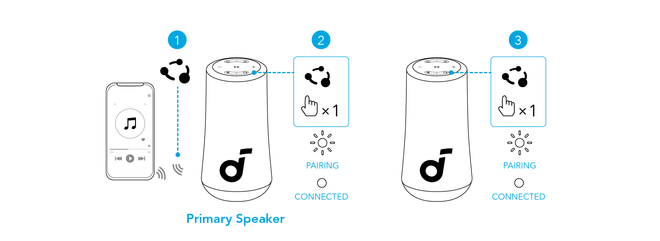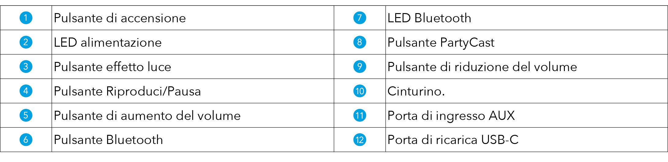 Con un altoparlante collegato a uno smartphone, premere il pulsante PartyCast su fino a 100 altoparlanti soundcore con funzione PartyCast per sincronizzare l'audio e la luce.