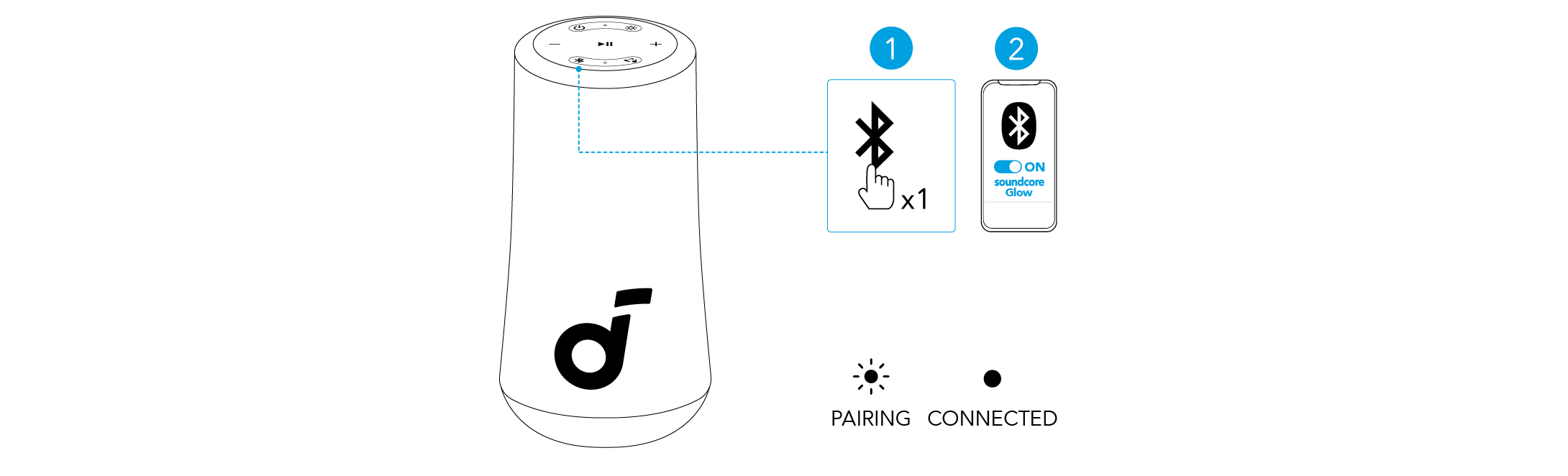 Premere il pulsante Bluetooth per entrare in modalità di accoppiamento Bluetooth, quindi selezionare "soundcore Glow" dalla lista Bluetooth per connettersi.