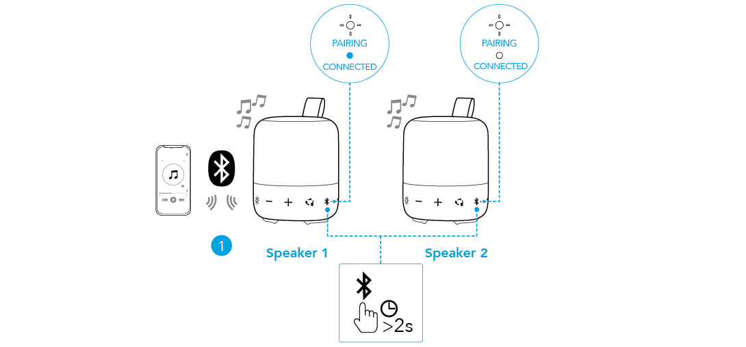 Подключите один динамик к смартфону, затем удерживайте кнопку Bluetooth на двух динамиках в течение 2 секунд, чтобы войти в режим сопряжения TWS.