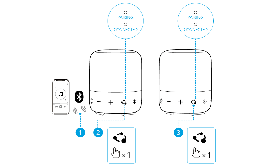 عندما يتم توصيل مكبر صوت واحد بالهاتف الذكي، اضغط على زر PartyCast على ما يصل إلى 100 مكبر صوت soundcore مزود بوظيفة PartyCast لمزامنة الصوت والإضاءة.