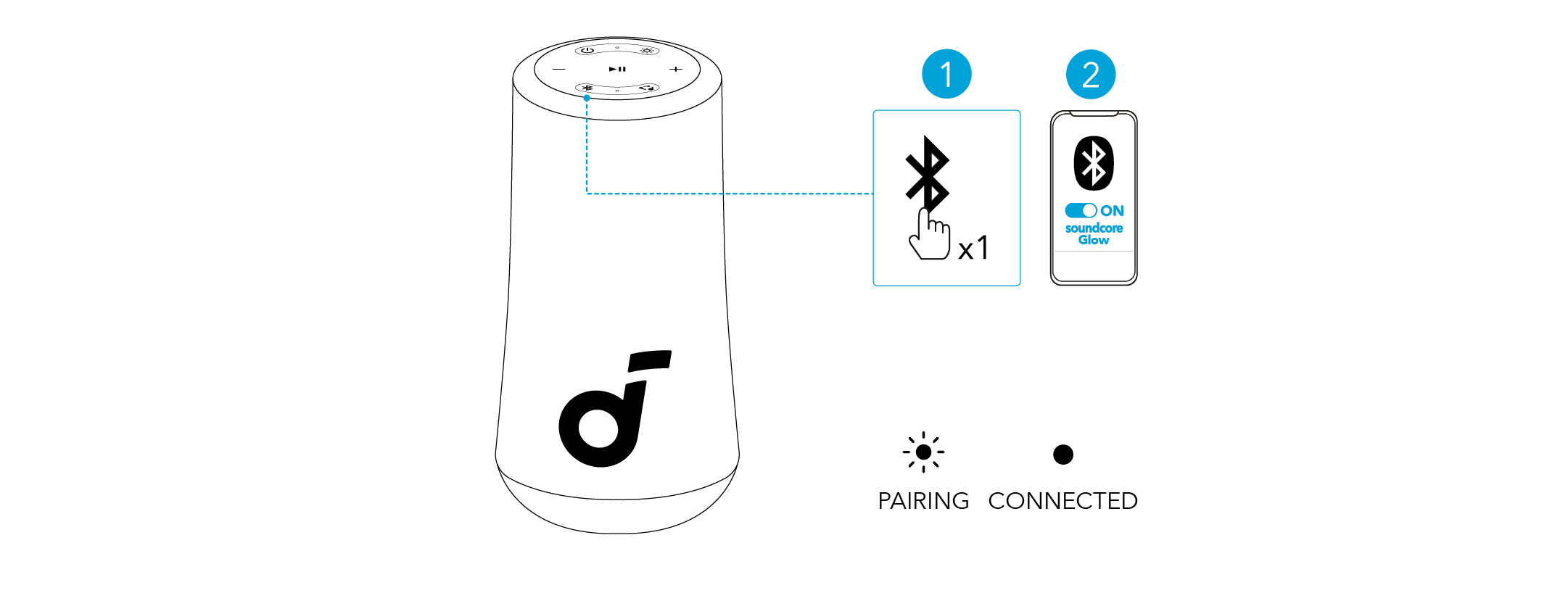 按下蓝牙按钮进入蓝牙配对模式,然后从蓝牙列表中选择“soundcore Glow”进行连接。