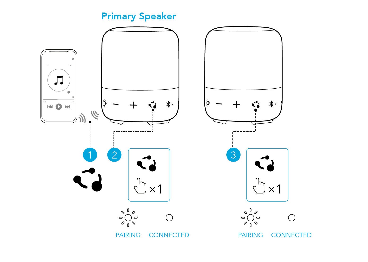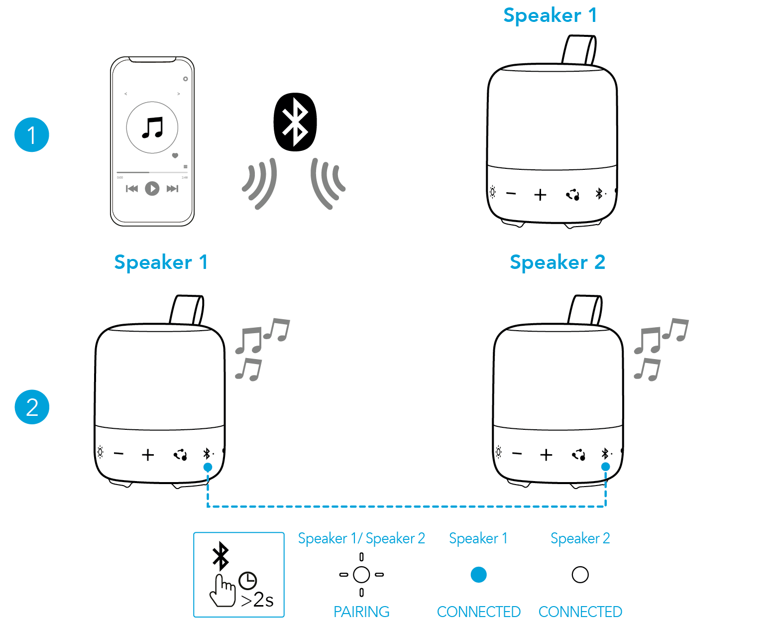 将一个音箱连接到智能手机后,在两个音箱上按住蓝牙按钮2秒钟,即可进入TWS配对模式。