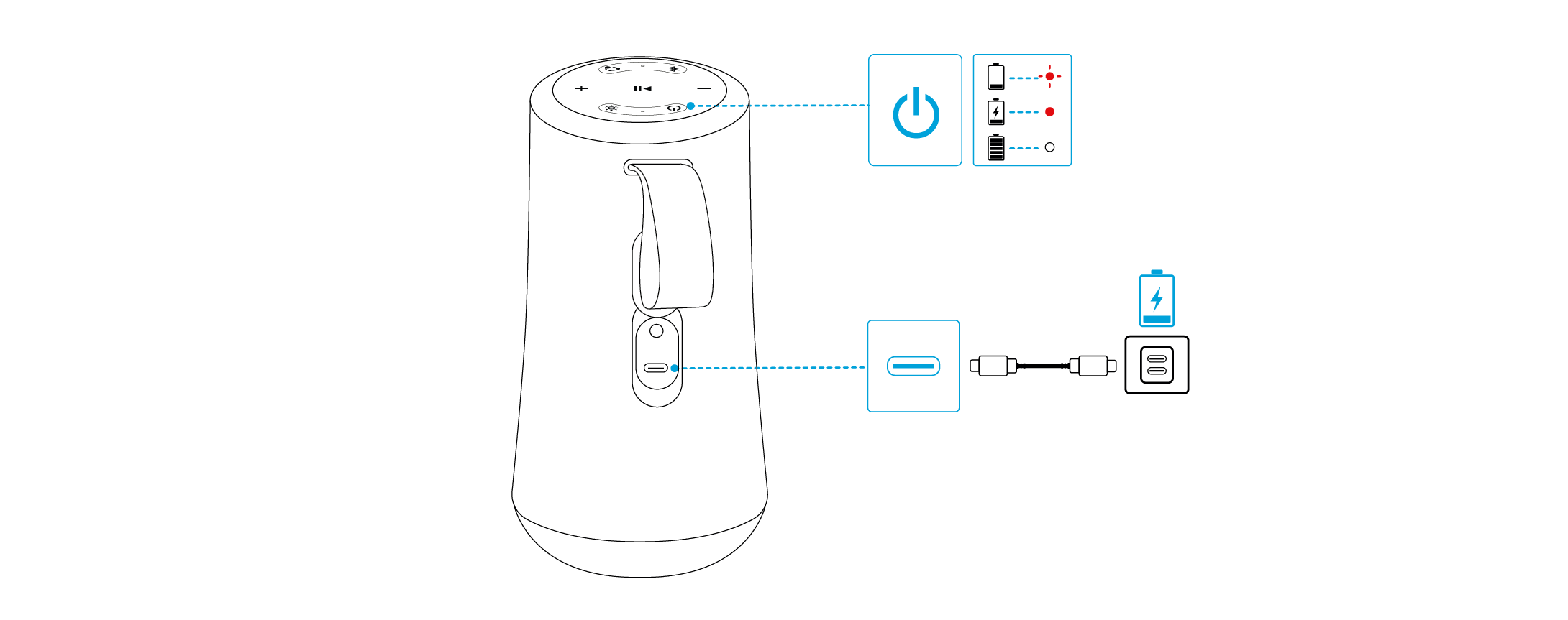 - 揚聲器每次開機時,都會自動連接至上次連線的裝置 (如果在藍牙範圍內)。如果沒有,請按下藍牙按鈕來進入藍牙配對模式。