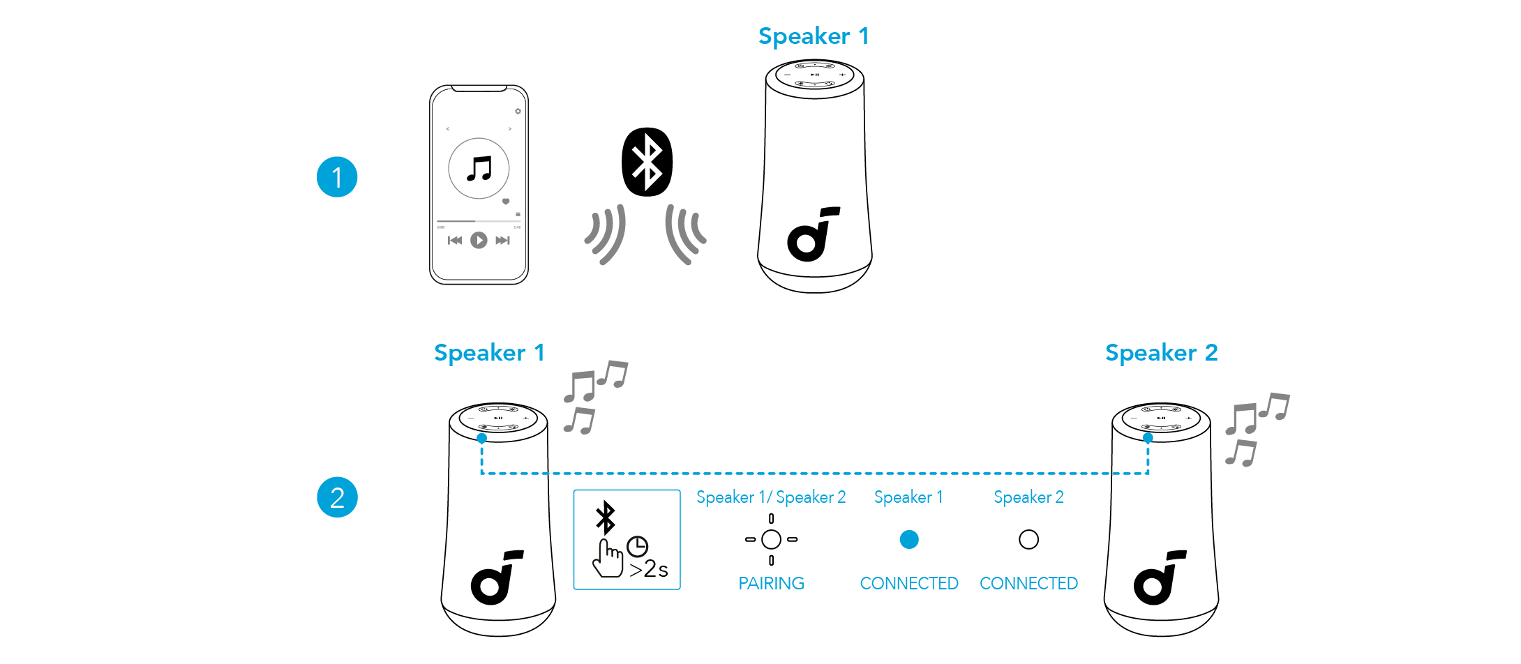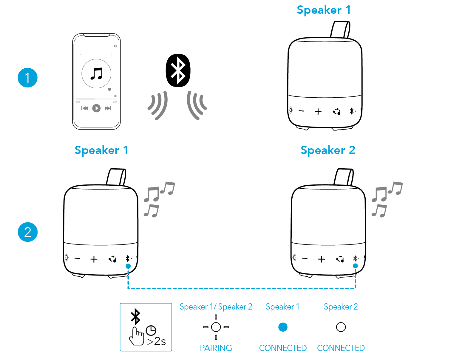 將一個揚聲器連接到智慧型手機後,在兩個揚聲器上按住藍牙按鈕2秒鐘進入TWS配對模式。