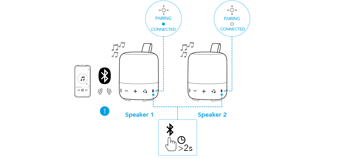 Med en högtalare ansluten till en smartphone, tryck och håll ned Bluetooth-knappen i 2 sekunder på två högtalare för att komma in i TWS-parningsläge.