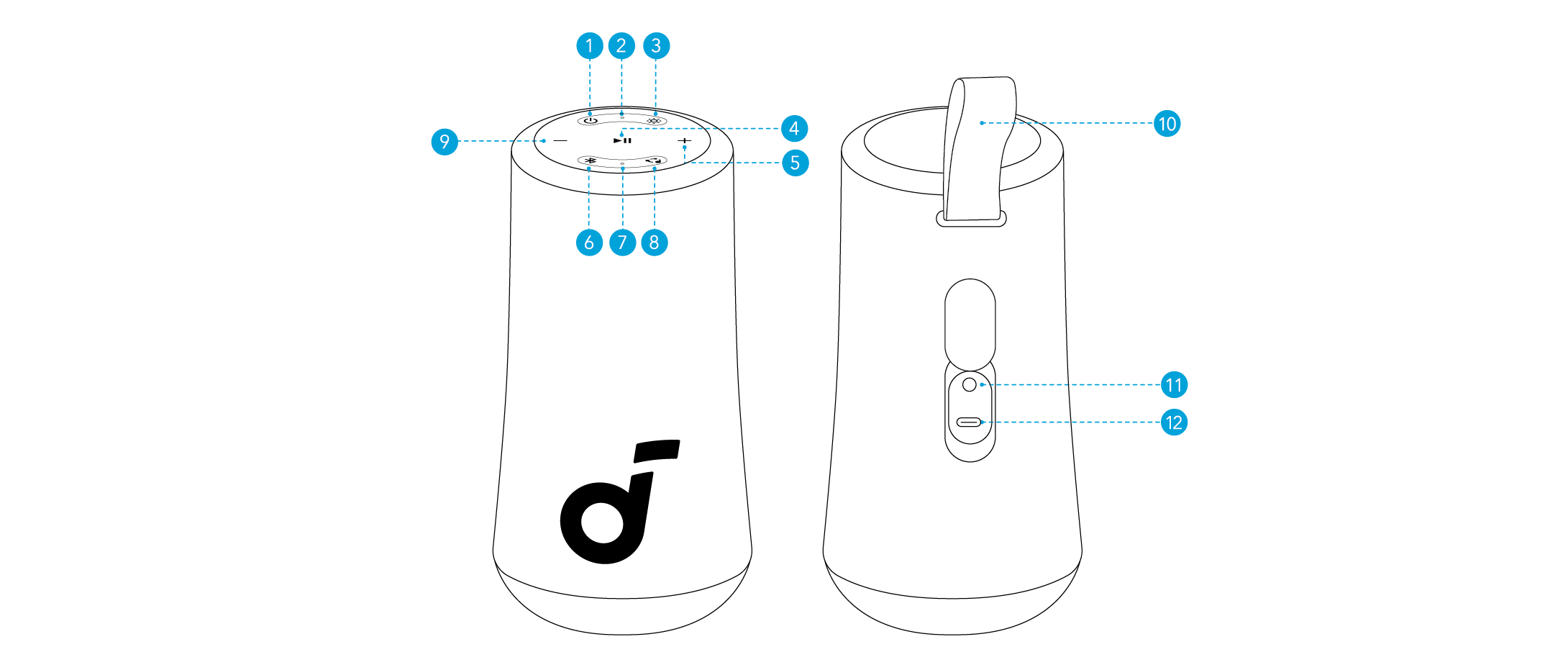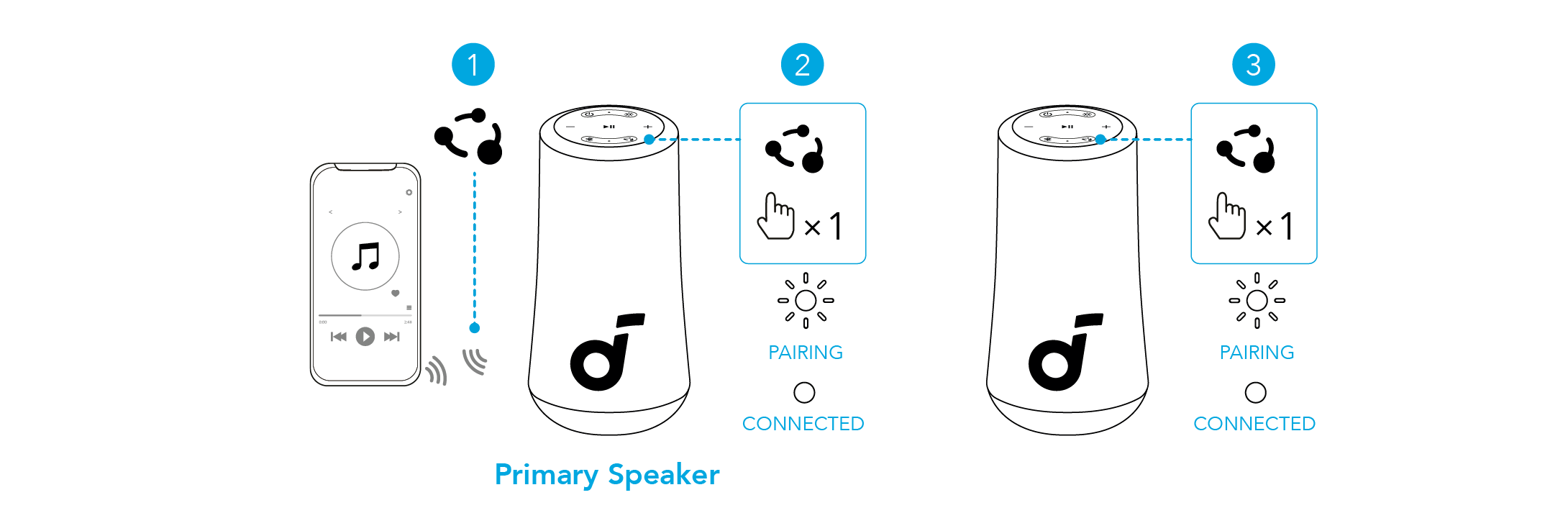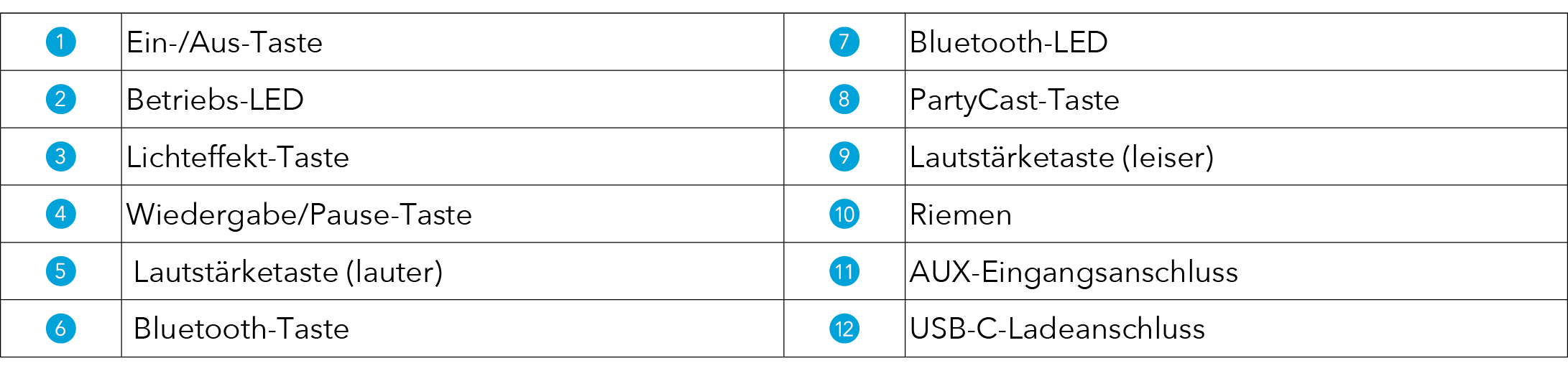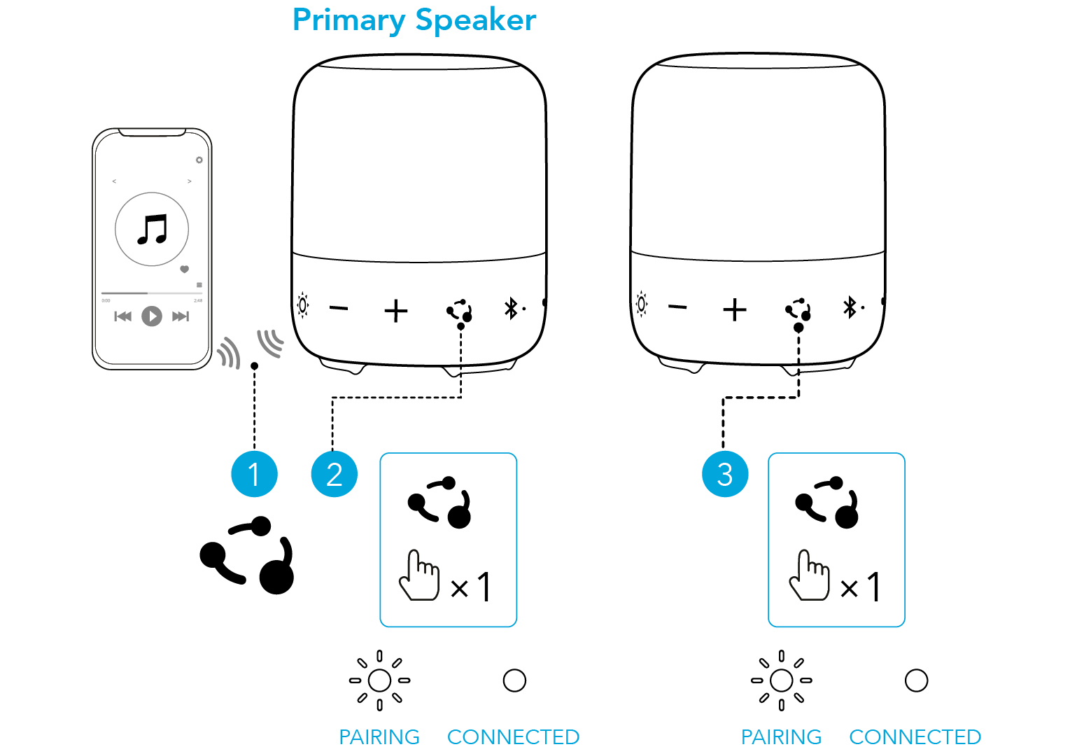 Wenn ein Lautsprecher mit einem Smartphone verbunden ist, drücken Sie die PartyCast-Taste an bis zu 100 soundcore-Lautsprechern mit PartyCast-Funktion, um Audio und Licht zu synchronisieren.