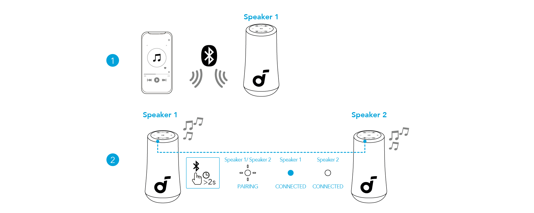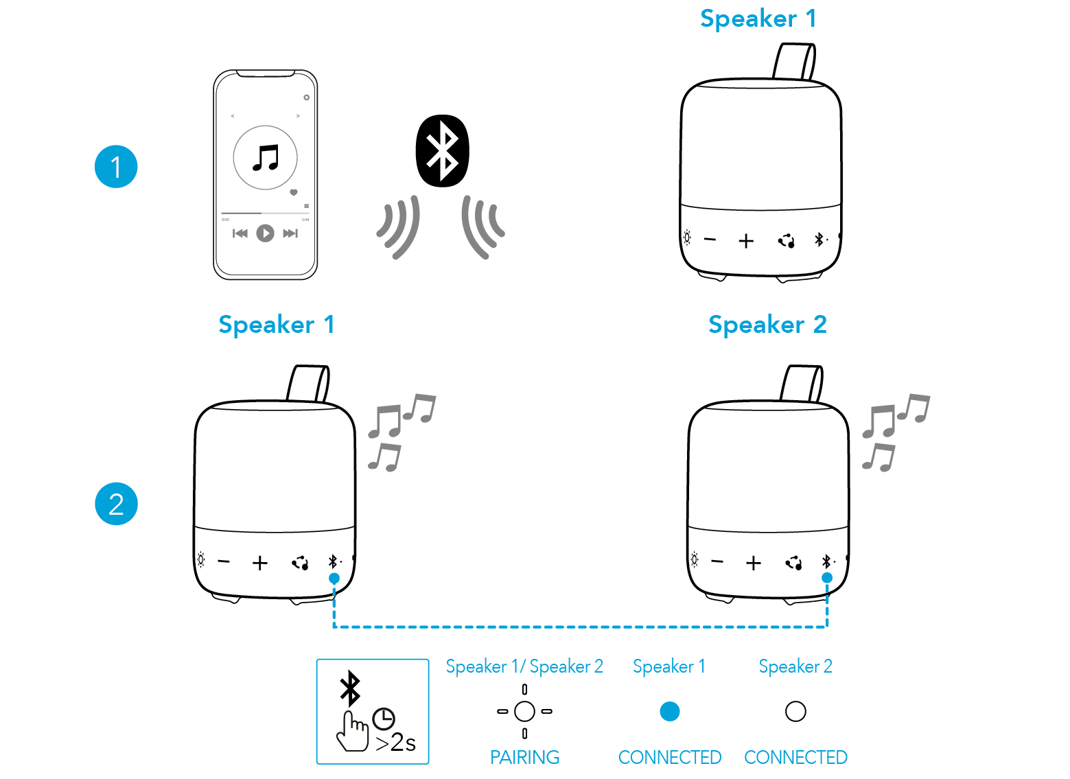 Wenn ein Lautsprecher bereits mit einem Smartphone verbunden ist, drücken und halten Sie die Bluetooth-Taste an beiden Lautsprechern für 2 Sekunden, um in den TWS-Kopplungsmodus zu wechseln.