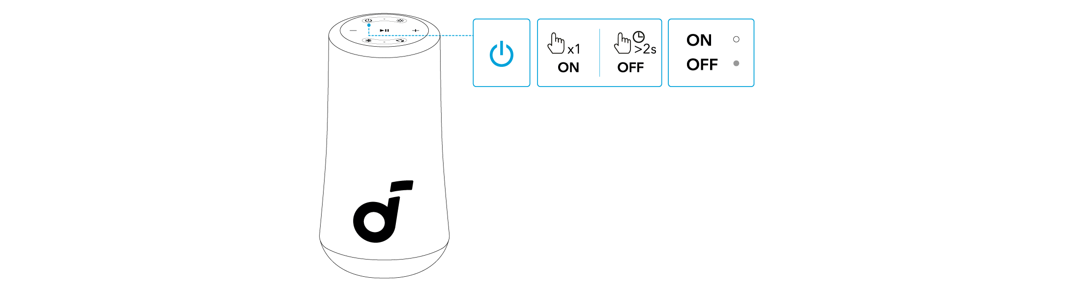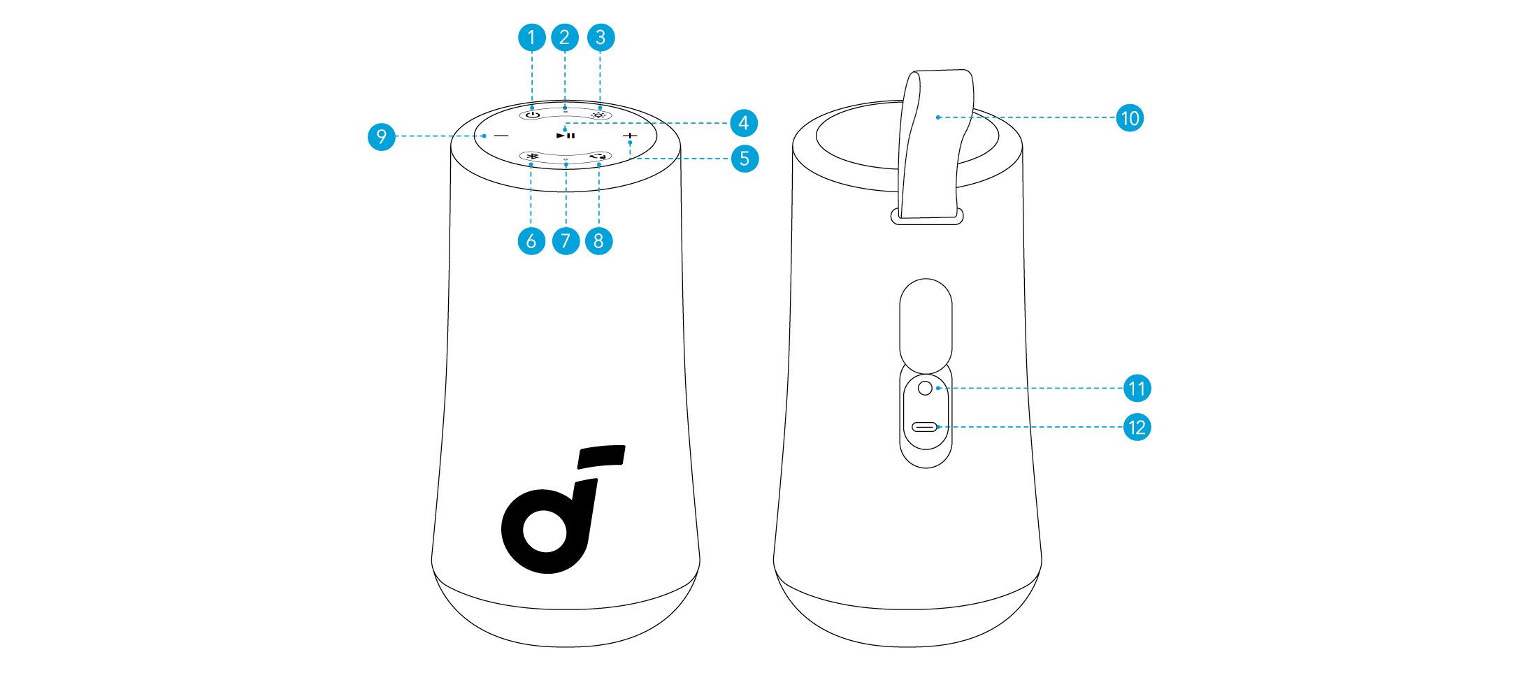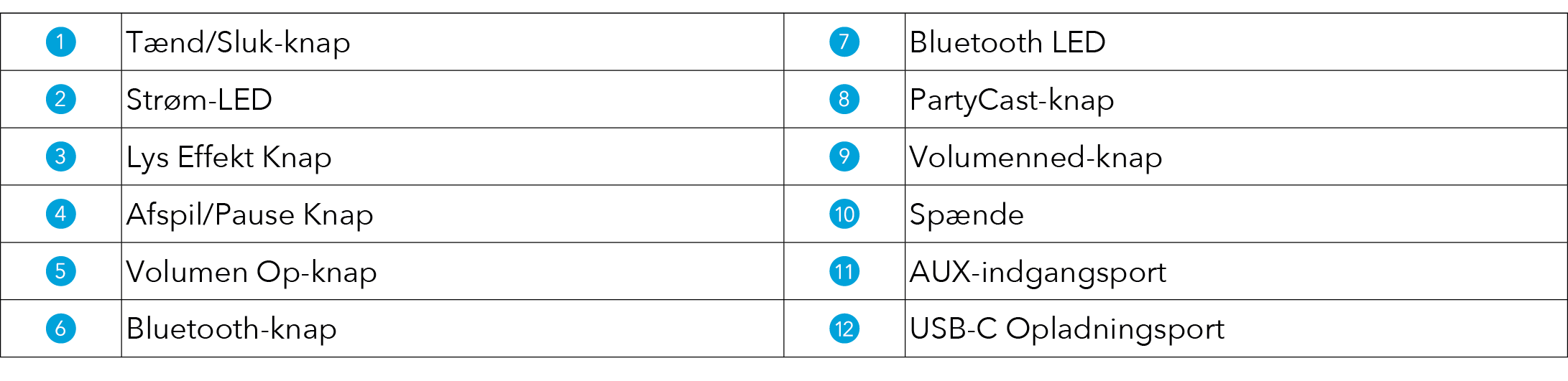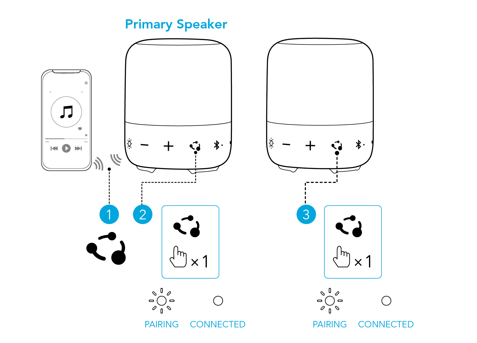 Med en højttaler tilsluttet en smartphone, skal du trykke på PartyCast-knappen på op til 100 soundcore-højttalere med PartyCast-funktion for at synkronisere lyd og lys.