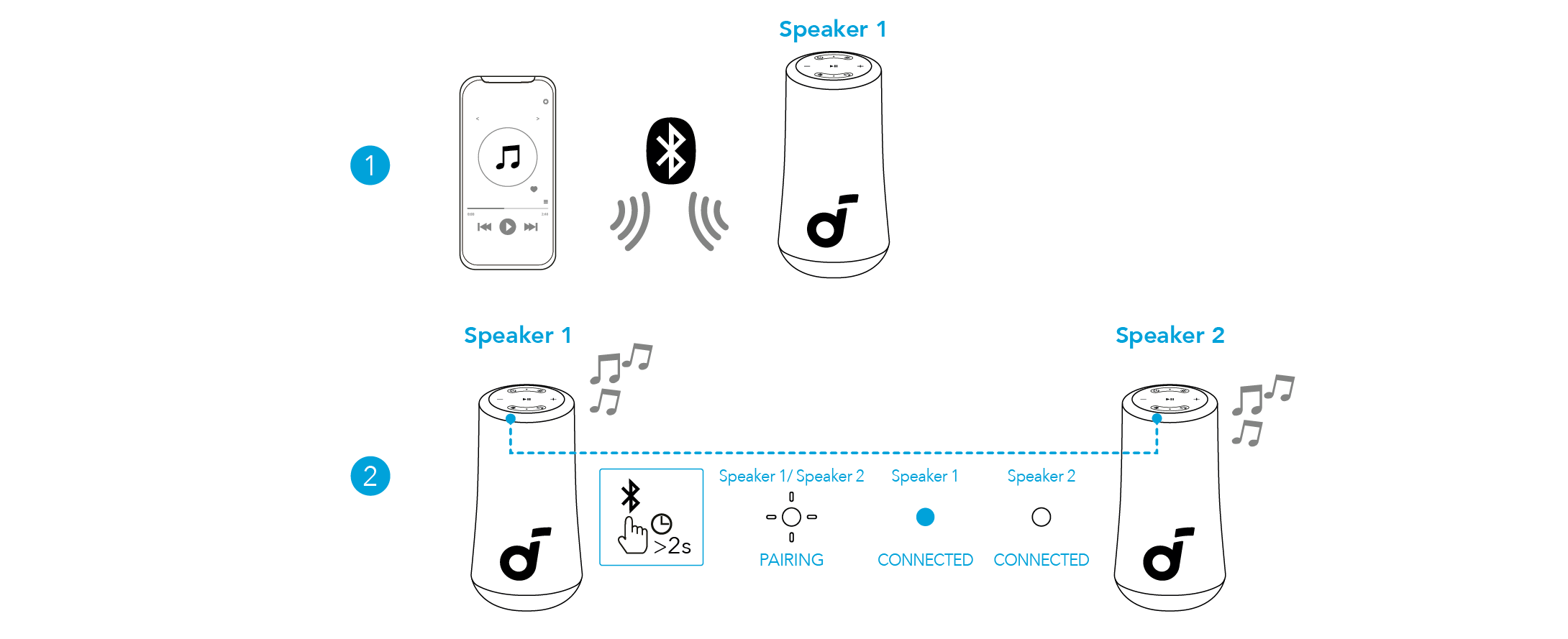 To identiske soundcore-højttalere kan parres med hinanden for stereolyd. Begge højttalere kan afspille den samme lyd (én som venstre kanal og den anden som højre kanal).
