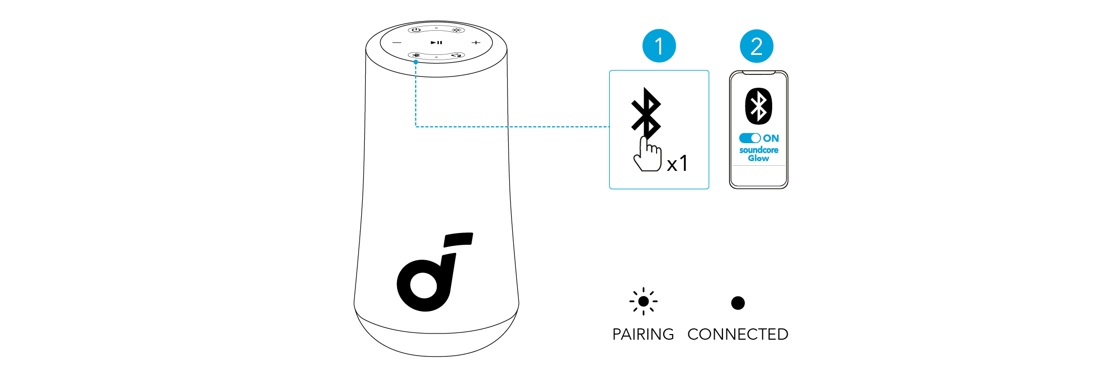 Tryk på Bluetooth-knappen for at komme ind i Bluetooth-parringstilstand, og vælg derefter "soundcore Glow" fra Bluetooth-listen for at oprette forbindelse.