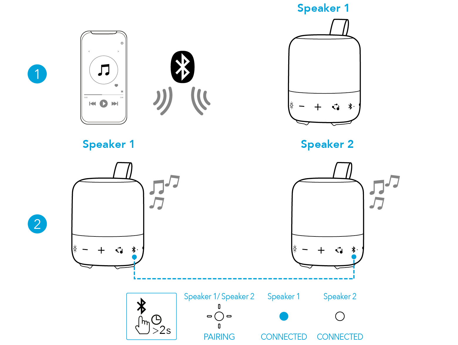 Med en højttaler tilsluttet en smartphone, skal du trykke og holde Bluetooth-knappen i 2 sekunder på to højttalere for at komme ind i TWS-parringstilstand.
