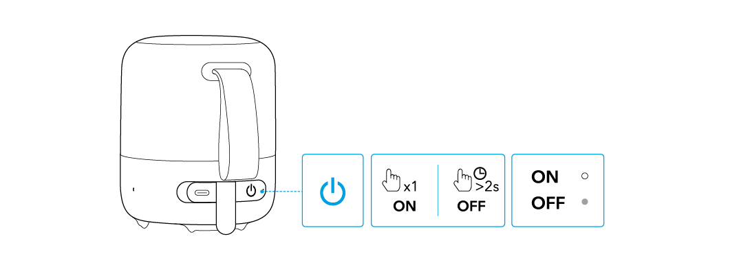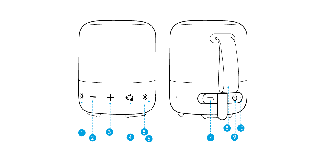 Med én høyttaler tilkoblet en smarttelefon, trykk på PartyCast-knappen på opptil 100 soundcore-høyttalere med PartyCast-funksjon for å synkronisere lyd og lys.