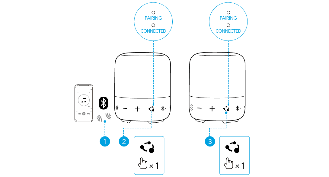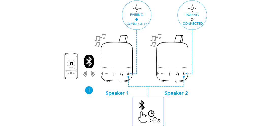 Med én høyttaler tilkoblet en smarttelefon, trykk og hold Bluetooth-knappen i 2 sekunder på to høyttalere for å gå inn i TWS-parringmodus.