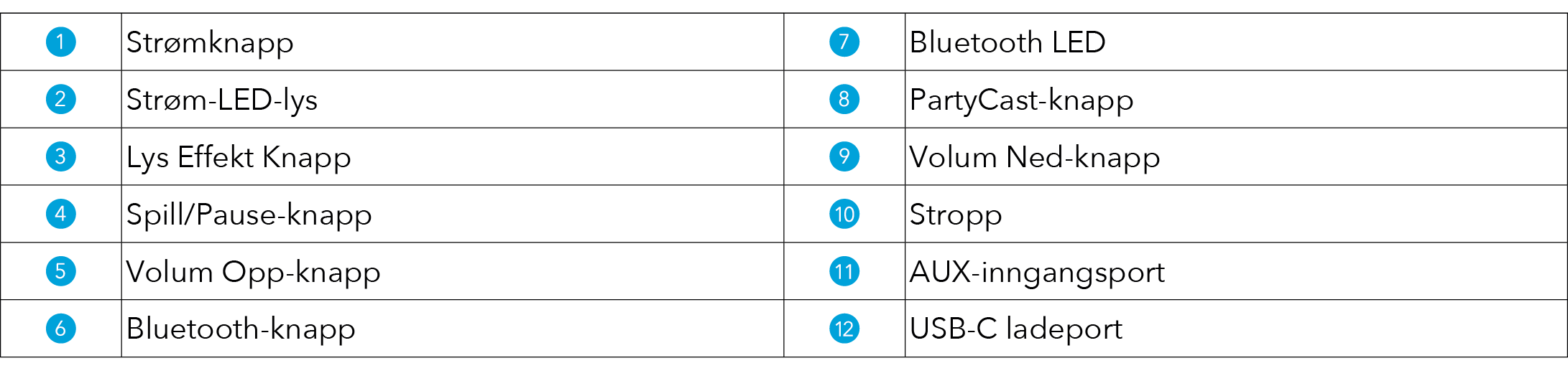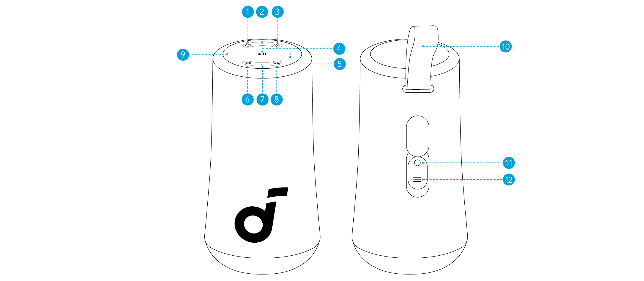 Med én høyttaler tilkoblet en smarttelefon, trykk på PartyCast-knappen på opptil 100 soundcore-høyttalere med PartyCast-funksjon for å synkronisere lyd og lys.