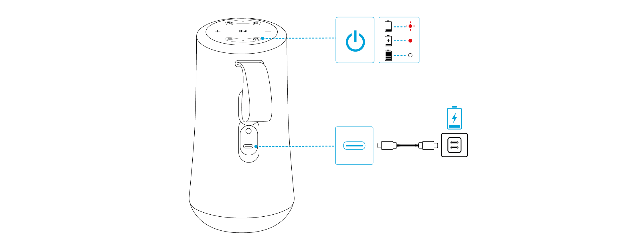 Batteristatus: Indikerer gjenstående batterinivå på høyttaleren.