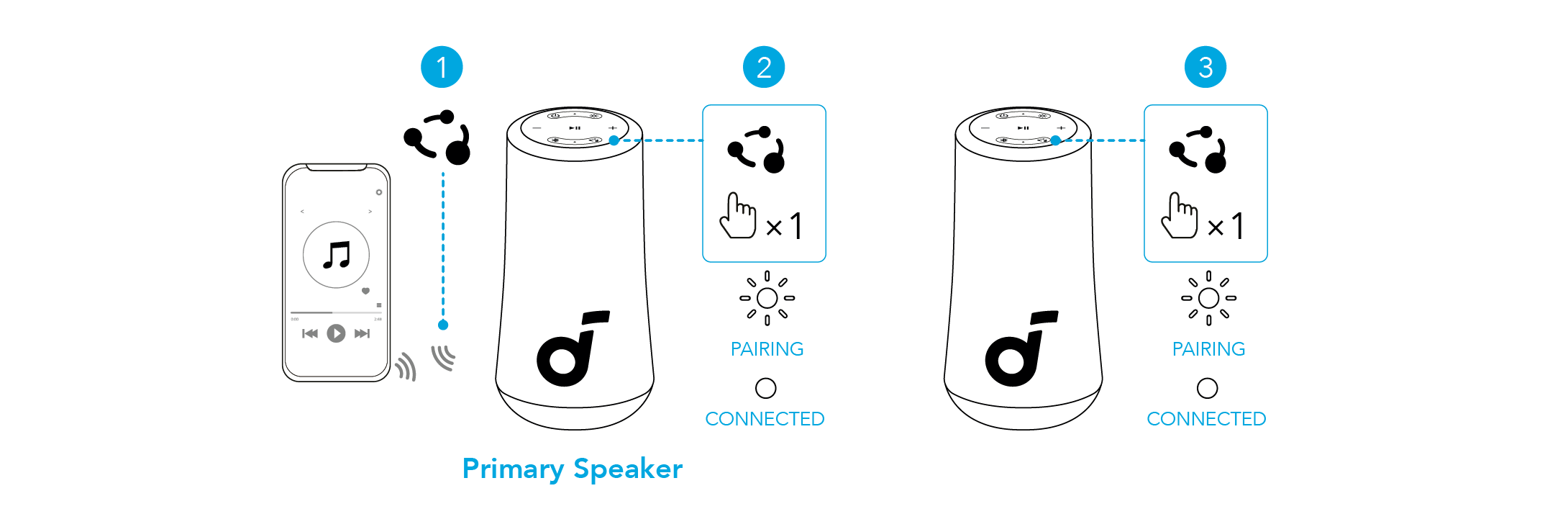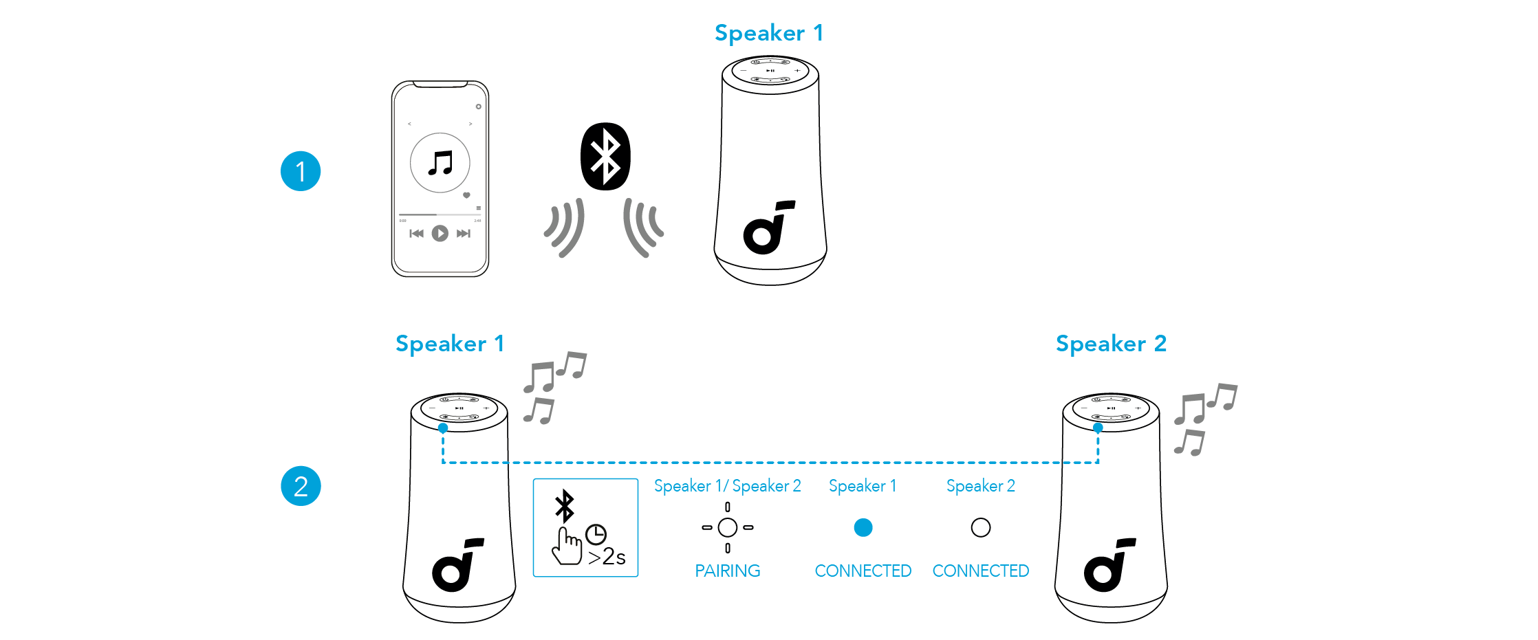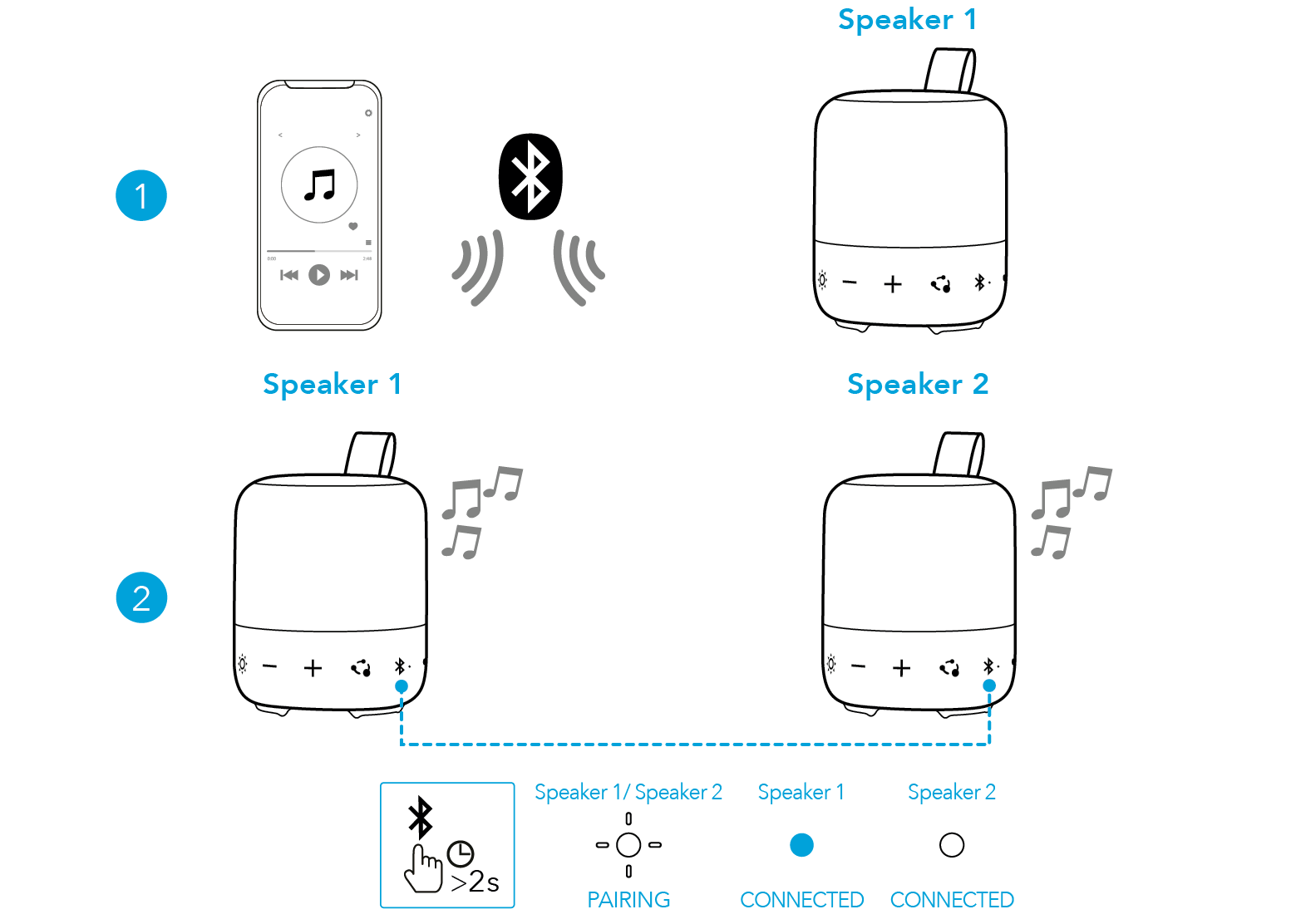 Med én høyttaler tilkoblet en smarttelefon, trykk og hold Bluetooth-knappen i 2 sekunder på to høyttalere for å gå inn i TWS-parringmodus.