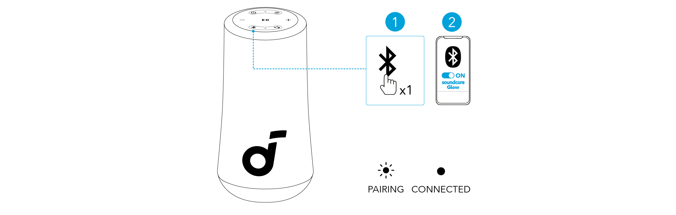Trykk på Bluetooth-knappen for å gå inn i Bluetooth-parringmodus, og velg deretter "soundcore Glow" fra Bluetooth-listen for å koble til.