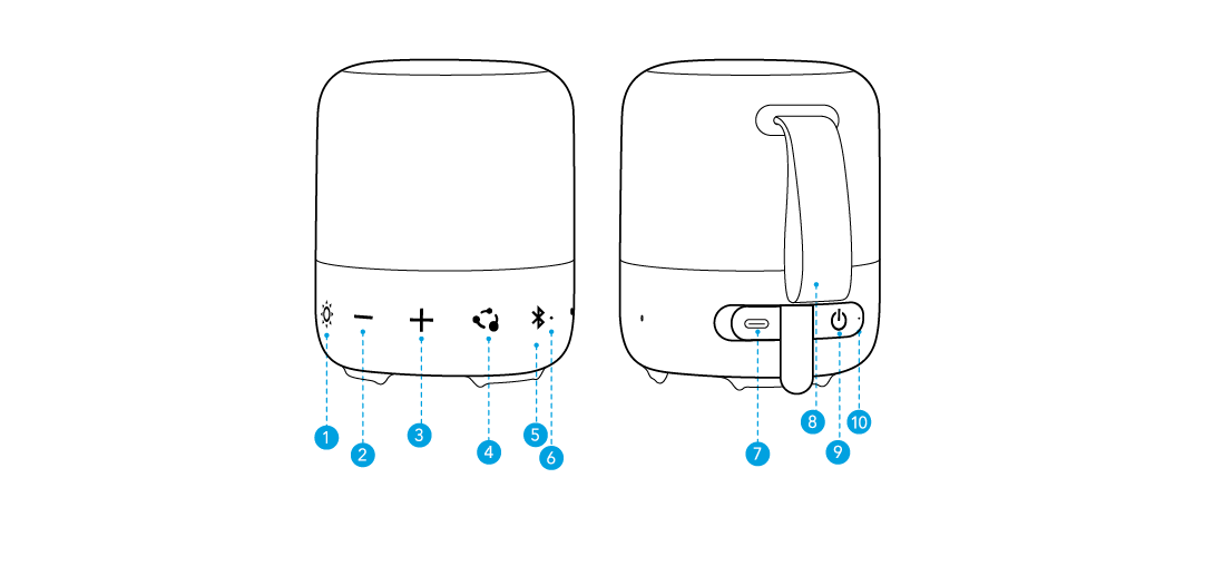Met één luidspreker verbonden met een smartphone, druk op de PartyCast-knop op maximaal 100 soundcore-luidsprekers met PartyCast-functie om audio en licht te synchroniseren.