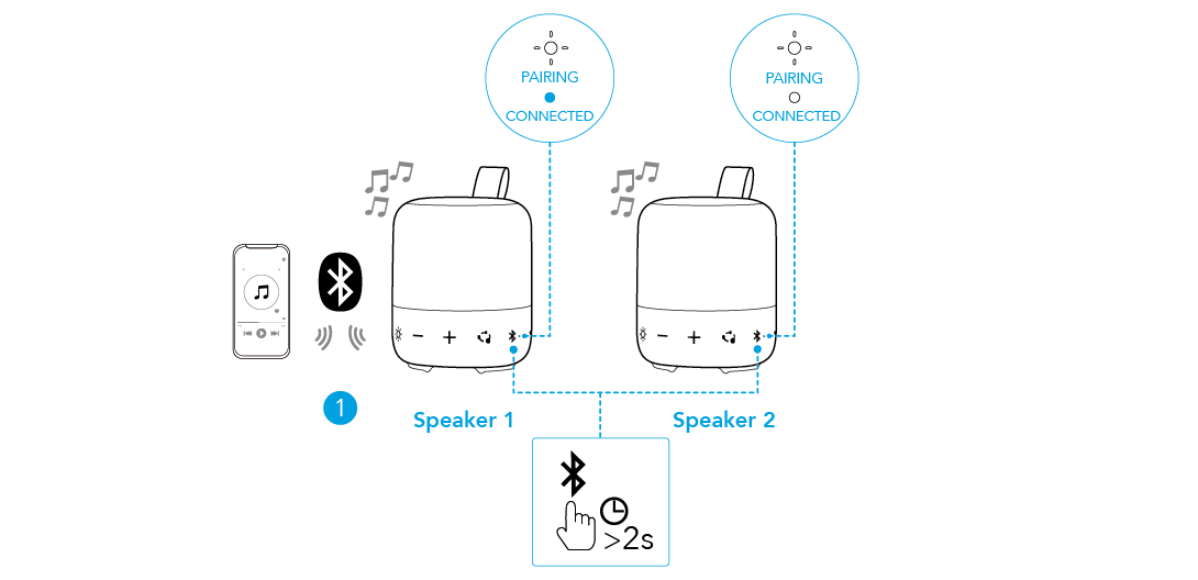 Met één luidspreker aangesloten op een smartphone, druk en houd de Bluetooth-knop gedurende 2 seconden ingedrukt op twee luidsprekers om de TWS-koppelingsmodus in te voeren.