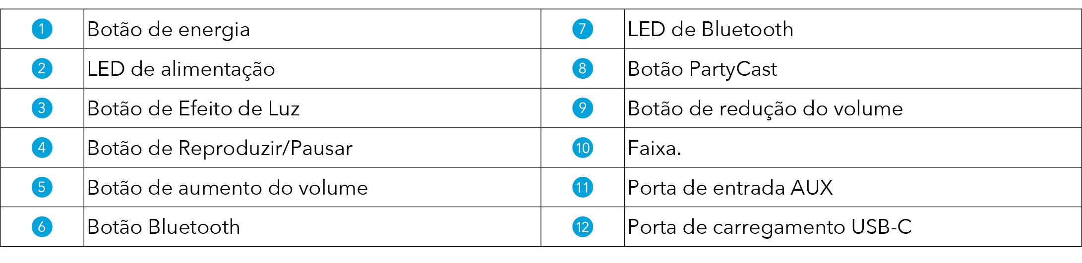Status da bateria: Indica o nível de carga restante da bateria do seu alto-falante.