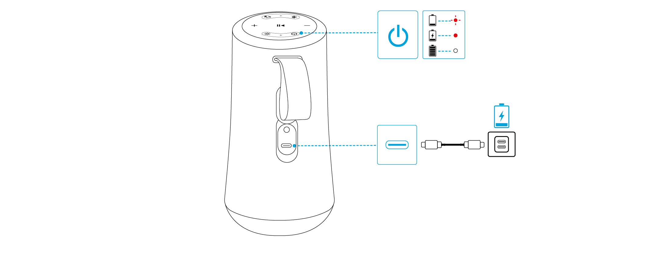 - Toda vez que você ligar sua caixa de som, ela se conectará automaticamente ao último dispositivo conectado caso ele esteja disponível no alcance do Bluetooth. Se não estiver disponível, pressione o botão Bluetooth para entrar no modo de emparelhamento Bluetooth.