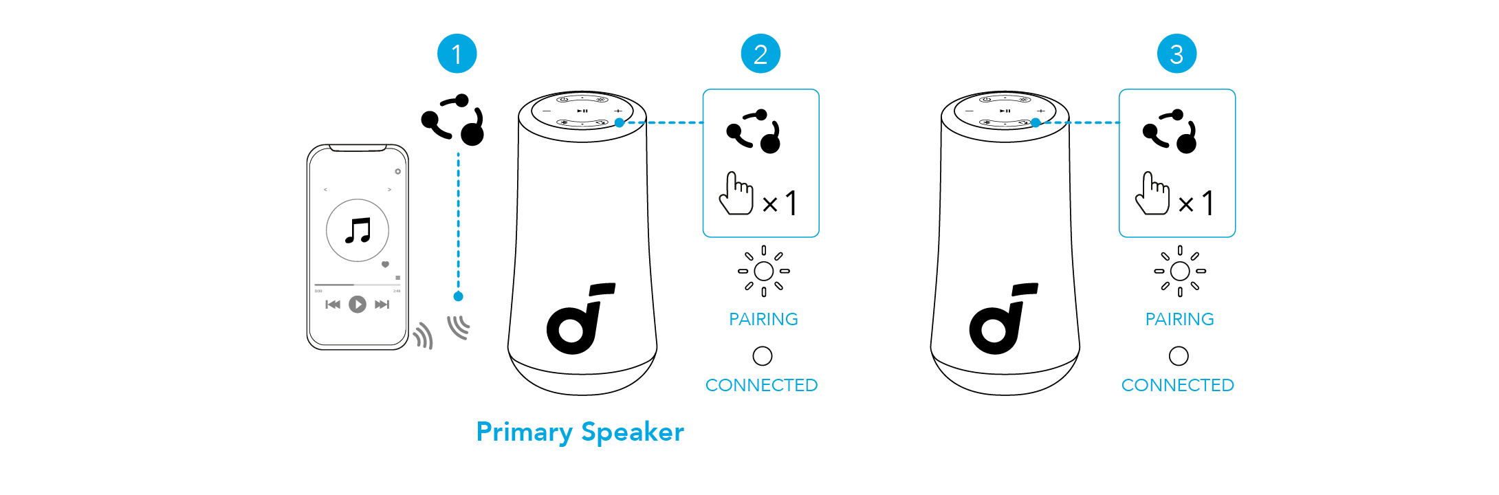 Com um alto-falante conectado a um smartphone, pressione o botão PartyCast em até 100 alto-falantes soundcore com função PartyCast para sincronizar áudio e luz.