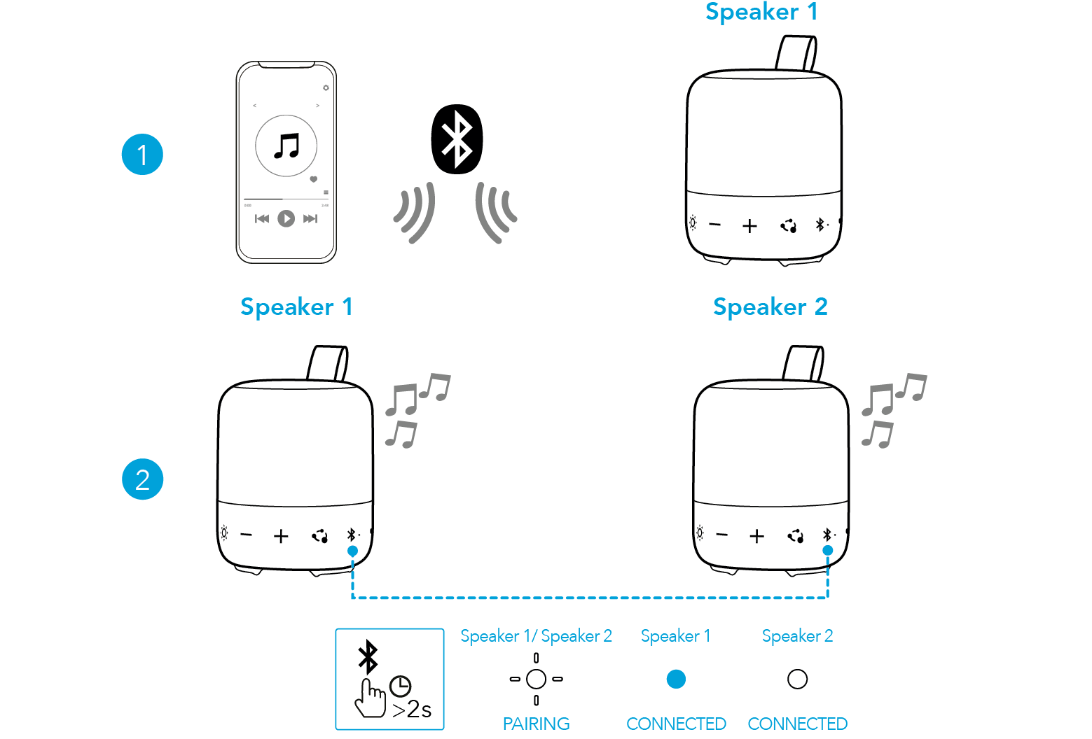 Com um alto-falante conectado a um smartphone, pressione e segure o botão Bluetooth por 2 segundos em dois alto-falantes para entrar no modo de emparelhamento TWS.