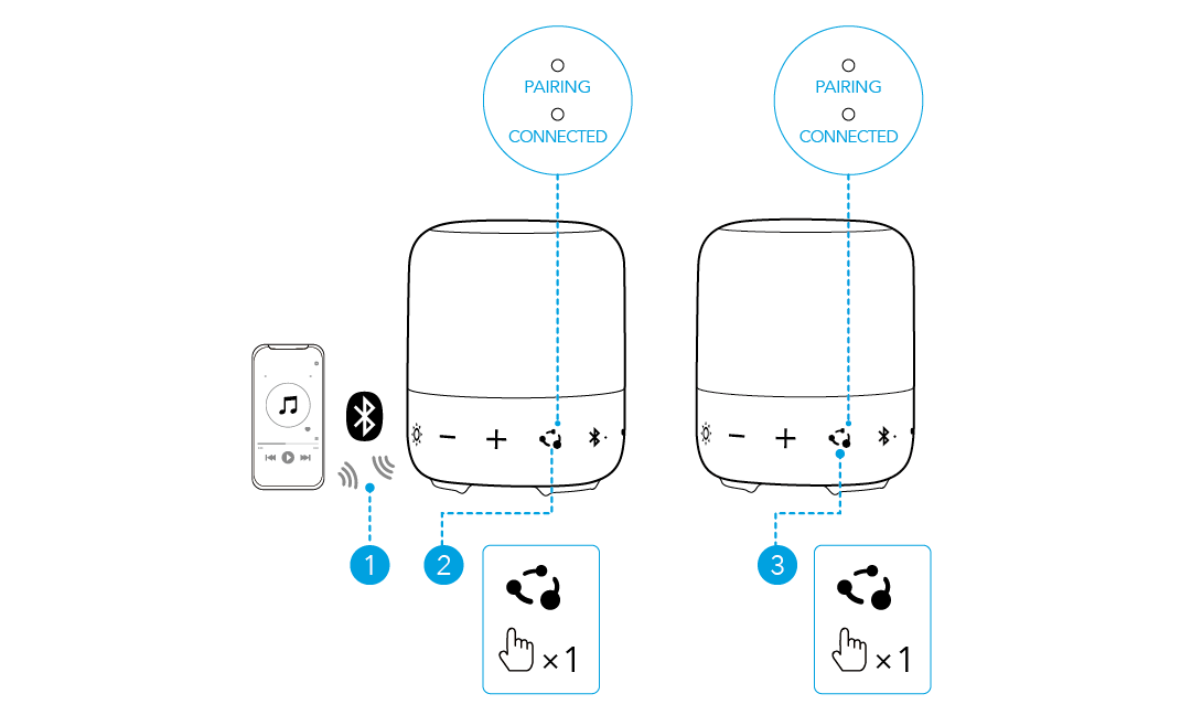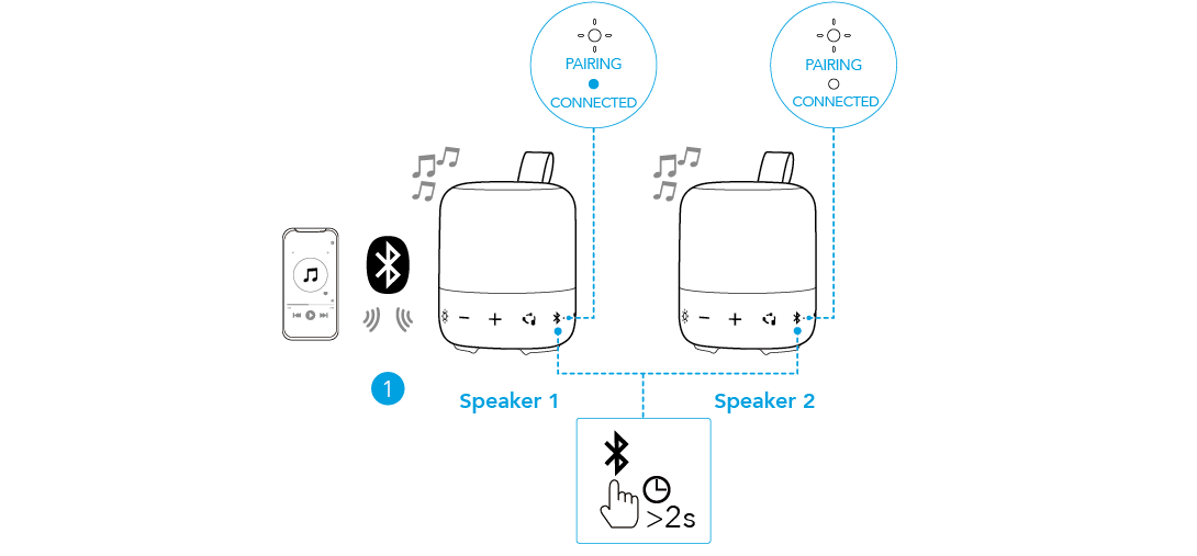 Com um alto-falante conectado a um smartphone, pressione e segure o botão Bluetooth por 2 segundos em dois alto-falantes para entrar no modo de emparelhamento TWS.