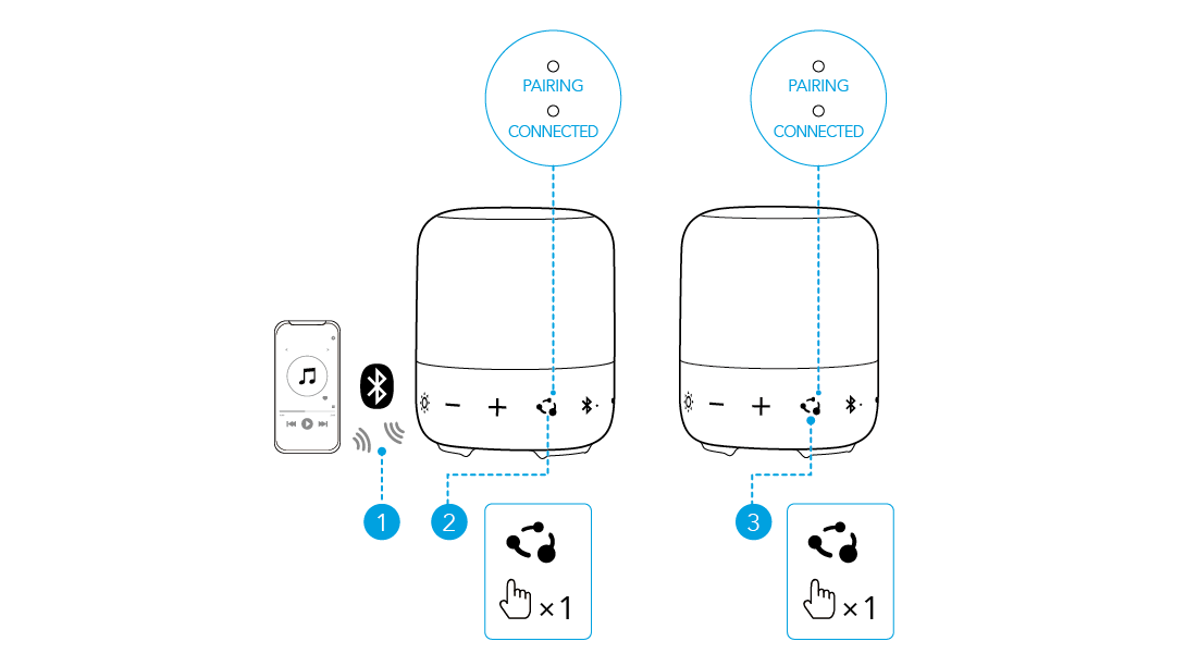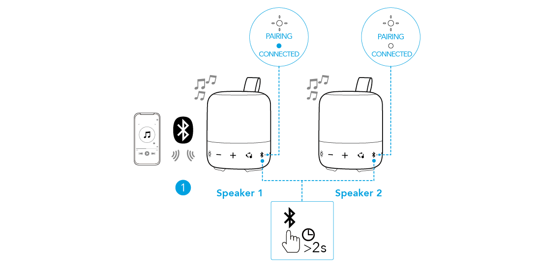 Con un altoparlante collegato a uno smartphone, premere e tenere premuto il pulsante Bluetooth per 2 secondi su due altoparlanti per entrare in modalità di accoppiamento TWS.