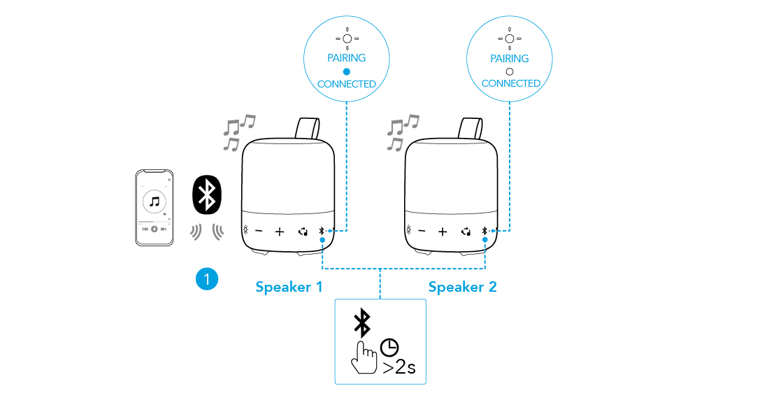 Yhdistä yksi kaiutin älypuhelimeen ja pidä Bluetooth-painiketta painettuna kahden kaiuttimen kohdalla 2 sekunnin ajan TWS-pariliitostilaan siirtymiseksi.