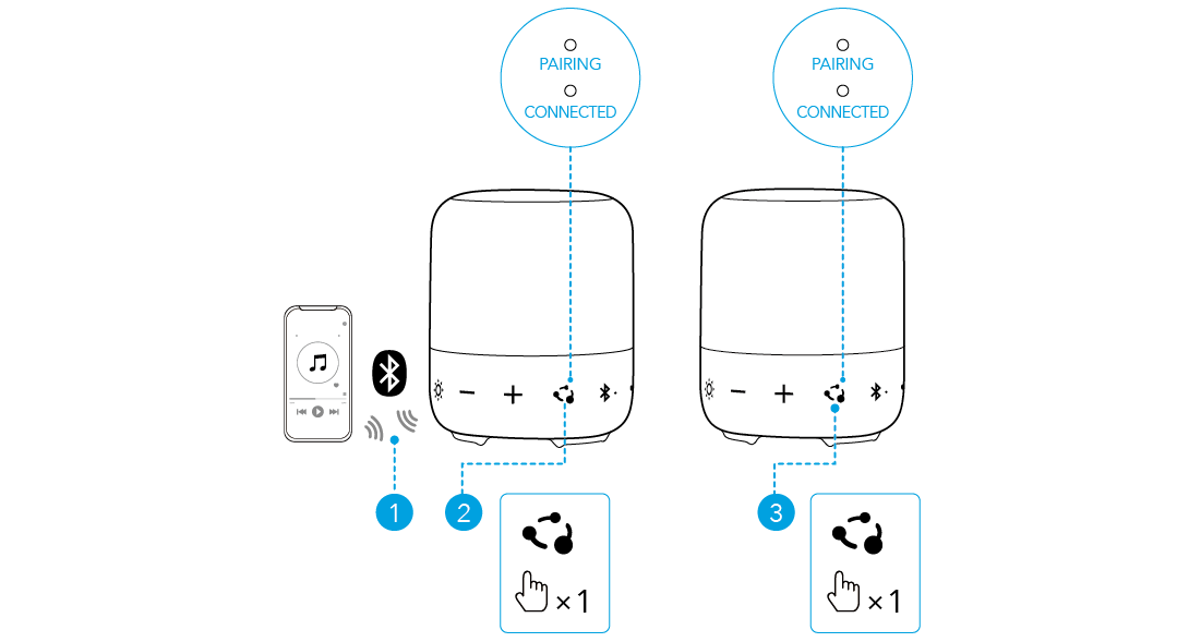 Yhdistä yksi kaiutin älypuhelimeen ja paina PartyCast-painiketta jopa 100 soundcore-kaiuttimessa, joissa on PartyCast-toiminto, synkronoidaksesi äänen ja valon.